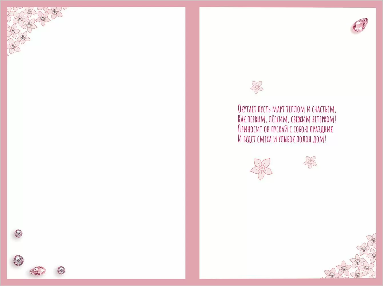 Открытка «С 8 Марта. С праздником весны и тепла!» в формате А5 станет прекрасным дополнением к любому подарку! Дизайн выполнен в нежных розово-пастельных тонах: в центре композиции — изящный букет розовых тюльпанов, украшенных капельками росы, сияющими бриллиантами и веточками мимозы. Фон оформлен мягкими градиентными переходами от светло-розового к кремовому, создающими ощущение лёгкости, чистоты и весеннего пробуждения. Внутри открытки — трогательные стихи с теплыми пожеланиями. Такой презент станет изящным дополнением к основному подарку, подчеркнёт внимание и сделает поздравление особенно запоминающимся! Изделие выполнено из качественных материалов и отличается высокой чёткостью печати, что гарантирует прочность, долговечность и делает открытку замечательным памятным сувениром для получателя.