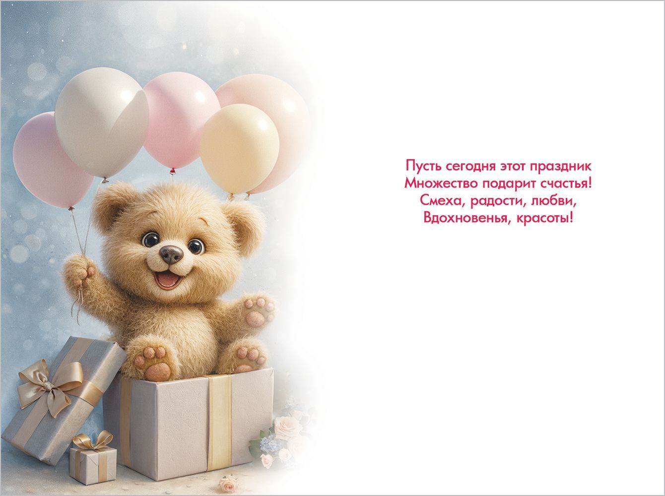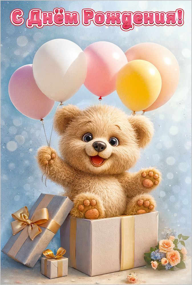 Открытка формата А5 предназначена для оформления поздравлений с днём рождения и ориентирована на использование в розничной продаже и оптовых поставках для магазинов подарков, книжных сетей и торговых точек с сопутствующей продукцией. Изделие изготовлено из плотного картона, обеспечивающего достаточную жёсткость, устойчивость к изгибам и сохранение геометрии при транспортировке и хранении. Размер готового изделия 182 × 122 мм позволяет размещать открытку в стандартных витринных и почтовых конвертах, а также формировать ровные стопы при укладке в короба и на складские стеллажи. Лицевая сторона оформлена полноцветным изображением: медвежонок в подарочной коробке на фоне воздушных шаров и подарков, в верхней части размещена надпись «С Днём Рождения!», что делает назначение открытки однозначным и позволяет использовать её как универсальное решение для поздравления детей и взрослых. Печатное изображение дополнено глянцевым УФ-лаком, который подчёркивает цветовую насыщенность, повышает стойкость к истиранию, снижает риск выцветания при экспонировании на витрине и облегчает удаление случайных загрязнений с поверхности. Внутри предусмотрен готовый поздравительный текст, что сокращает время обслуживания покупателей в рознице и упрощает выбор для конечного пользователя, при этом остаётся свободное место для личной подписи и дополнений. Конструкция открытки рассчитана на многократное перелистывание без расслоения картона и деформации сгиба при стандартных условиях эксплуатации. Упаковка по 10 штук удобна для формирования заказов, ведения учёта и планирования ассортимента, обеспечивает единообразный внешний вид выкладки и оптимальную плотность при транспортировке. Открытка подходит для индивидуальных поздравлений, вложения в подарочные наборы, использования в корпоративных подарках и может быть включена в постоянный ассортимент как типовая позиция сезонно-востребованной категории.