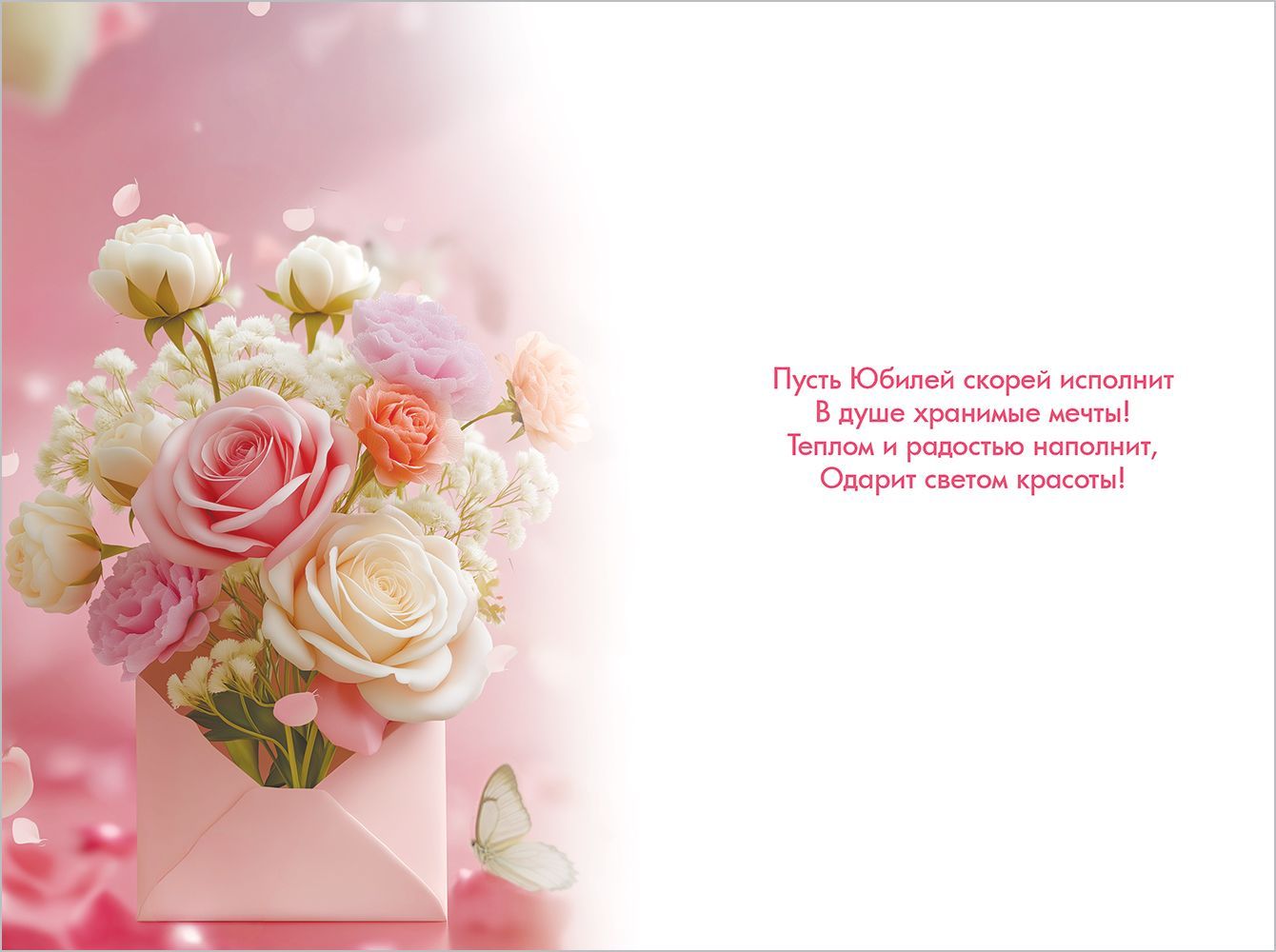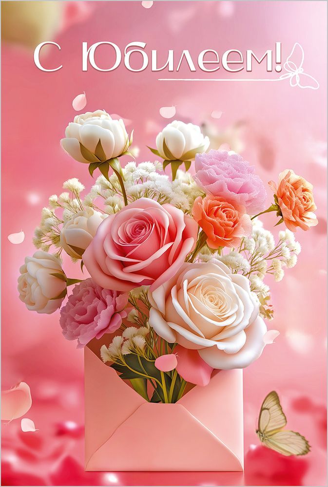 Открытка формата А5 с юбилейной тематикой предназначена для оформления поздравлений в розничных и корпоративных сценариях, а также для стабильного присутствия в ассортименте оптовых закупщиков. Лицевая сторона выполнена в розово-персиковой гамме с реалистичным изображением букета роз и садовых цветов, помещённых в конверт, на однородном градиентном фоне с лепестками и бабочкой; в верхней части размещена надпись «С Юбилеем!», хорошо читаемая на расстоянии витринной выкладки. Основой служит картон, обеспечивающий достаточную жёсткость, устойчивость к изгибам при транспортировке и хранении, а также аккуратный внешний вид при выкладке в кассовой зоне, на полочных и напольных стендах. Размер готового изделия 182 × 122 мм позволяет использовать открытку с большинством стандартных конвертов соответствующего формата и удобно размещать её в файловых системах и дисплеях для полиграфии. Поверхность лицевой стороны обработана глянцевым УФ-лаком, что повышает стойкость красочного слоя к истиранию, уменьшает риск выцветания при длительном экспонировании под освещением и облегчает уход (удаление случайных загрязнений сухой мягкой салфеткой). Внутри предусмотрен готовый поздравительный текст, что удобно для розничного покупателя при ограниченном времени на подготовку поздравления и обеспечивает предсказуемый сценарий использования в торговых сетях: открытка сразу готова к вручению после краткого личного дополнения. Плотность картона и типовая конструкция сгиба рассчитаны на многократное открывание без заметной деформации, что важно для получателя при длительном хранении в альбомах или коробках для памятных дат. Стандартный прямоугольный формат упрощает упаковку, транспортировку и хранение в коробах и термоусадочной плёнке, а также позволяет формировать равномерные стопы без перекоса. В одной упаковке 10 штук, что удобно для планирования оптовых поставок, поддержания стабильного наличия позиции на полке и формирования сбалансированного ассортимента юбилейной тематики в магазинах подарков, книжных и канцелярских отделах.
