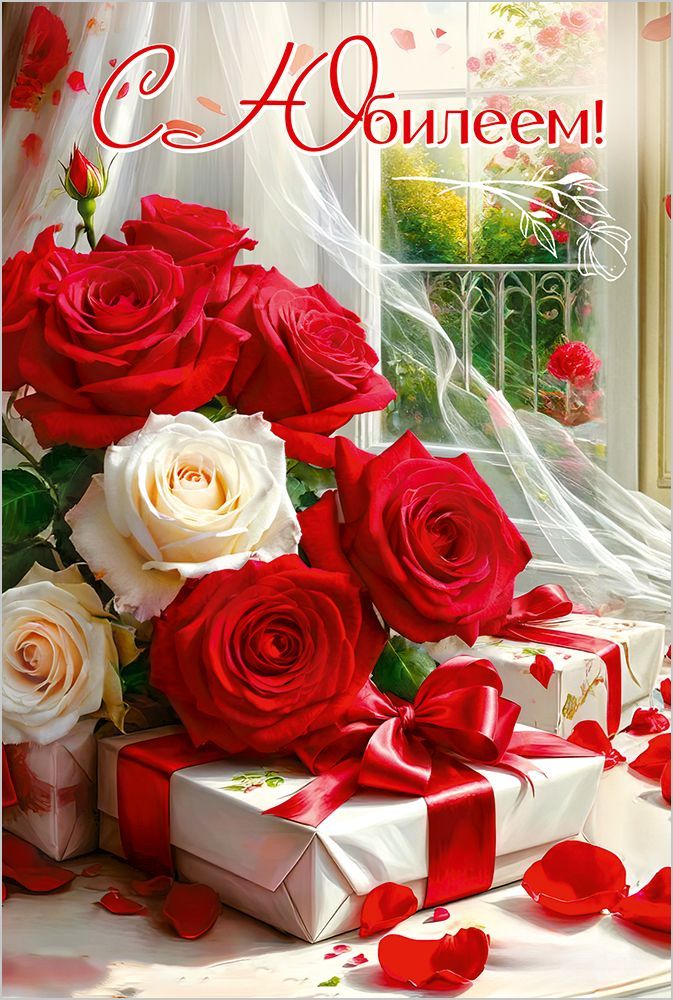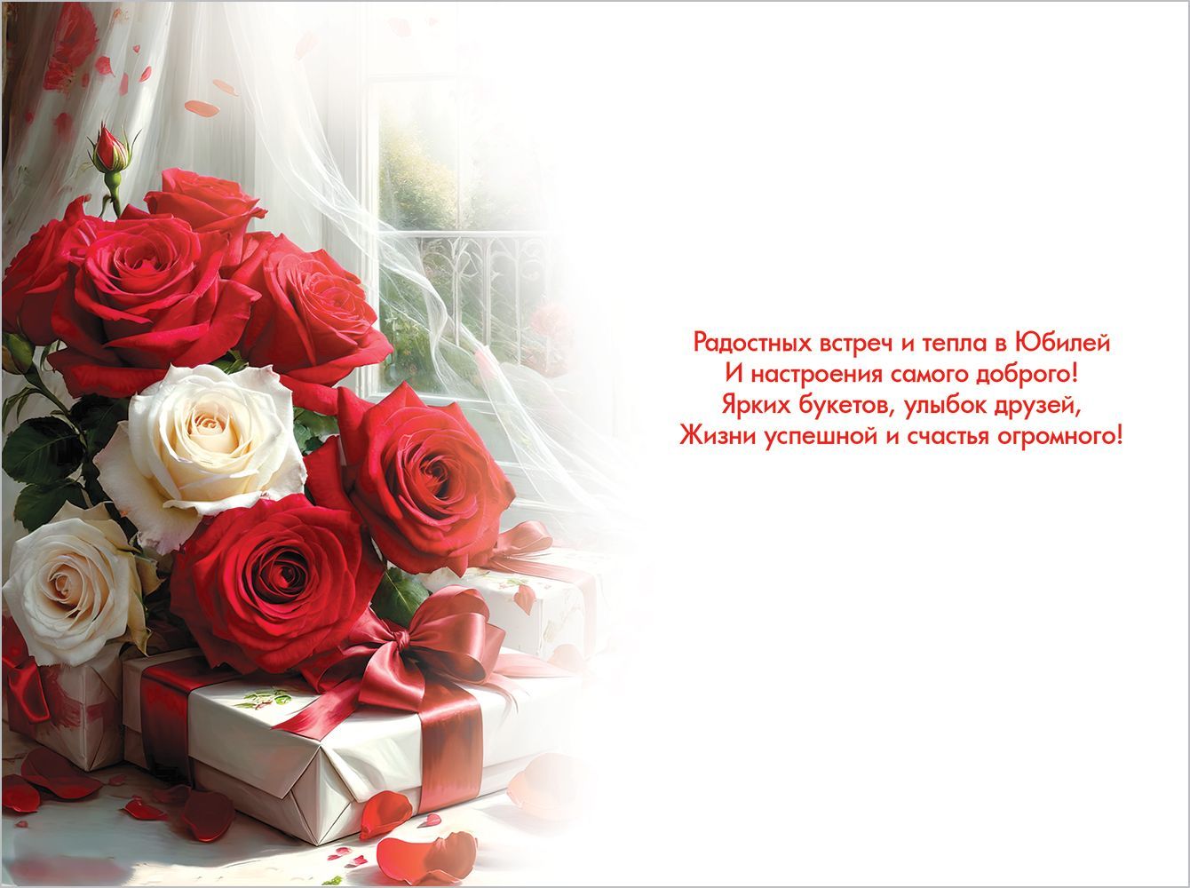 Открытка формата А5 «С Юбилеем» предназначена для розничной продажи и оптовых поставок в ассортименте праздничной продукции. Изделие изготовлено из плотного картона, обеспечивающего стабильную геометрию и сохранность формы при транспортировке, хранении и многократном перелистывании. Готовый размер 182 × 122 мм удобен для размещения в стандартных конвертах соответствующего формата и совместим с типовыми витринными и кассетными выкладками. Лицевая сторона оформлена крупной композиции из красных и кремовых роз, подарочных коробок и декоративных лепестков, на фоне светлого интерьера с окном, что визуально подчеркивает тематику торжественного юбилея и подходит для адресатов разного возраста. Изображение дополнено надписью «С Юбилеем!» в верхней части. Печатное оформление защищено и выделено глянцевым УФ-лаком, за счет чего поверхность приобретает выраженный блеск, повышенную стойкость к истиранию, загрязнениям и выцветанию, что важно при длительном хранении на складе и в торговом зале. Внутри открытки размещен поздравительный текст, позволяющий использовать изделие без дополнительной подготовки, при необходимости дополнив его личной надписью вручную. Материал картона адаптирован под стандартные шариковые и гелевые ручки, чернила не растекаются и быстро высыхают. Конструкция рассчитана на аккуратное раскрытие по центральной линии сгиба, без растрескивания печатного слоя. Открытка поставляется в упаковке по 10 штук, что удобно для формирования заказов, учета остатков и планирования полки в магазинах сувенирной и канцелярской группы. Такое решение подходит для использования в цветочных салонах, книжных и подарочных магазинах, корпоративных закупках к юбилейным мероприятиям сотрудников, а также для частных покупателей, которым требуется лаконичное и визуально выразительное поздравление к личному или профессиональному юбилею.