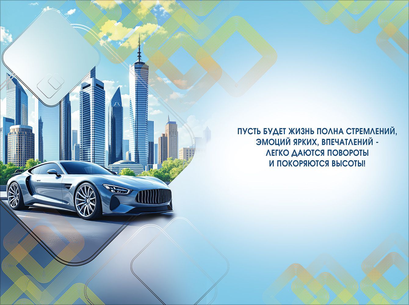 Открытка формата А5 предназначена для поздравления с днём рождения и ориентирована на современную мужскую аудиторию: на лицевой стороне изображён спортивный автомобиль на фоне городской архитектуры, композиция дополнена геометрическим орнаментом и надписью «С Днём Рождения!». Изделие изготовлено из плотного картона, устойчивого к изгибам и истиранию, что важно при транспортировке и хранении крупными партиями. Размер готовой открытки 182 × 122 мм обеспечивает совместимость с распространёнными форматами почтовых конвертов и витринными дисплеями, что упрощает выкладку и планирование полочного пространства. Двустороннее изображение и внутренний печатный текст позволяют использовать открытку без дополнительной полиграфии, экономя время на подготовке к продаже и конечному вручению. Отделка выполнена с применением золотой фольги и серебряного пантона, за счёт чего достигается выразительный, но контролируемый блеск, устойчивый к выцветанию и механическому воздействию при типичных условиях эксплуатации в розничных точках и при пересылке. Поверхность картона пригодна для нанесения подписей стандартными шариковыми и гелевыми ручками без размазывания чернил, что важно для конечного пользователя. Конструкция изделия рассчитана на хранение в горизонтальных и вертикальных планшетах, упаковка по 10 штук оптимальна для оптовых закупок, облегчает инвентаризацию и планирование остатков по сезонному спросу. Нейтральная тематическая направленность сюжета с автомобилем и городским пейзажем делает открытку универсальной для поздравления коллег, партнёров, клиентов и частных адресатов, что позволяет включать позицию в постоянный ассортимент магазинов подарков, книжных сетей и несетевых торговых точек.