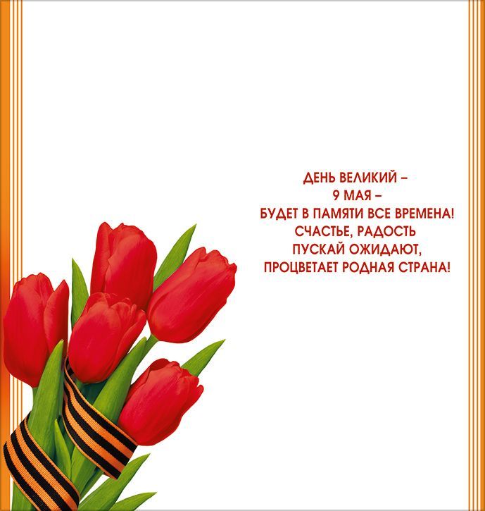 Открытка формата «Евро» посвящена Дню Победы и предназначена для использования в качестве поздравительного и памятного полиграфического изделия в розничных и оптовых поставках. Лицевая сторона оформлена в красно‑оранжевой гамме с крупной надписью «9 Мая», георгиевской лентой, изображением ордена и букетом красных тюльпанов, что обеспечивает узнаваемую тематическую привязку к официальным и корпоративным поздравлениям. Открытка изготовлена из плотного картона, что повышает жесткость, устойчивость к изгибам и истиранию при транспортировке и хранении, позволяет использовать изделие как самостоятельный поздравительный носитель или вложение в конверт соответствующего формата. Двустороннее изображение обеспечивает оформленность как внешней, так и внутренней стороны, внутри размещен готовый поздравительный текст, что сокращает время подготовки массовых рассылок и раздач при крупных мероприятиях, торжественных собраниях, акциях и праздничном оформлении торговых залов. Глянцевый УФ‑лак наносится на отдельные элементы изображения, подчеркивая цветовые акценты и одновременно выполняя защитную функцию от выцветания и мелких механических повреждений, что актуально при длительном складском хранении и активной выдаче посетителям. Размер готового изделия 204×97 мм обеспечивает совместимость с распространенными конвертами и дисплейными стойками, удобен для выкладки на прикассовых зонах и в напольных или настольных стендах. В упаковке 10 единиц, что позволяет оптимизировать учет и формирование заказов, а также удобно для формирования розничного ассортимента по сезонным позициям. Открытка подходит для вручения ветеранам, участникам памятных мероприятий, сотрудникам и партнерам, а также для личного поздравления в семейном и рабочем кругу.