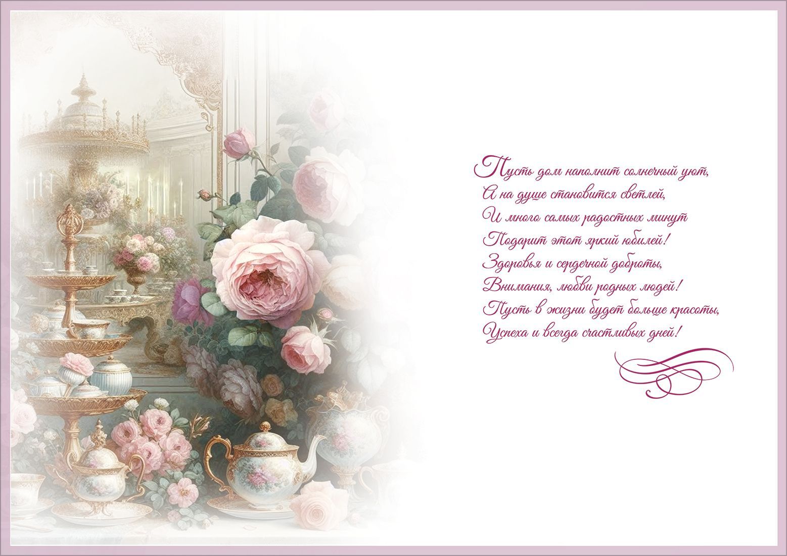 Открытка «С Юбилеем!» в формате А4 станет прекрасным дополнением к любому подарку. Каждую именинницу обязательно порадует и приятно удивит элегантный дизайн с изображением необыкновенной залы, в которой накрыт великолепный стол. Его богатая сервировка с изысканной посудой и живыми цветами создаст праздничное настроение и поразит изящными золотыми элементами. Нежно-розовые пионы крупными пионами дополняют волшебный сюжет. Внутри открытки – замечательные стихи с теплыми пожеланиями. Такой презент можно вручить в дополнение к основному подарку, чтобы украсить поздравление и сделать его более оригинальным. Изделие выполнено из качественных материалов, что обеспечивает ему прочность и долговечность, поэтому оно станет чудесным памятным сувениром для получателя.