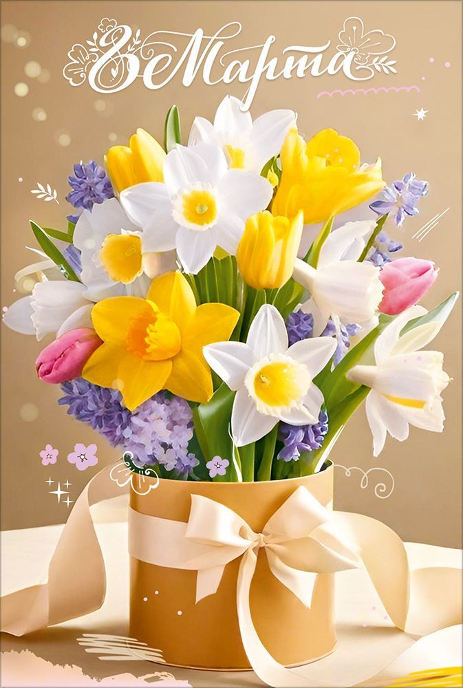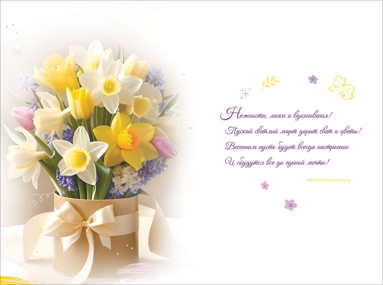 Открытка формата А5 предназначена для поздравления с 8 Марта и ориентирована на использование в розничной продаже и оптовых поставках для праздничного ассортимента. Изделие изготовлено из плотного картона, что обеспечивает стабильную форму, устойчивость к изгибам и истиранию при транспортировке, выкладке и хранении в стандартных стеллажных и кассетных системах. Размер готового изделия 182 × 122 мм позволяет размещать открытку в типовых конвертах и упаковочных пакетах, а также формировать равномерные стопы при оптовой фасовке и учёте. На лицевой стороне размещено цветное изображение букета весенних цветов в коробке с лентой на нейтральном фоне с надписью «8 Марта», дополненное декоративными элементами и золотистыми блестками в лаке, создающими акцентные глянцевые участки и устойчивый к истиранию декоративный слой. Двустороннее изображение обеспечивает оформленность как внешней, так и внутренней стороны; внутри нанесён поздравительный текст, что позволяет использовать открытку без дополнительной доработки, упрощает процесс вручения и делает изделие удобным для розничного покупателя. Поверхность картона пригодна для письма стандартными шариковыми и гелевыми ручками, маркерами средней насыщенности без сильного расплывания чернил. Конструкция рассчитана на многократное перелистывание, не требует специальных условий эксплуатации, достаточны обычные параметры сухого складского хранения. В упаковке 10 одинаковых экземпляров, что удобно для формирования партионных заказов, равномерного распределения по торговым точкам и планирования сезонных закупок к празднику. Открытка подходит для индивидуальных поздравлений, корпоративных поздравительных кампаний, вложения в подарочные наборы и использования в качестве дополнения к цветочной или сувенирной продукции.