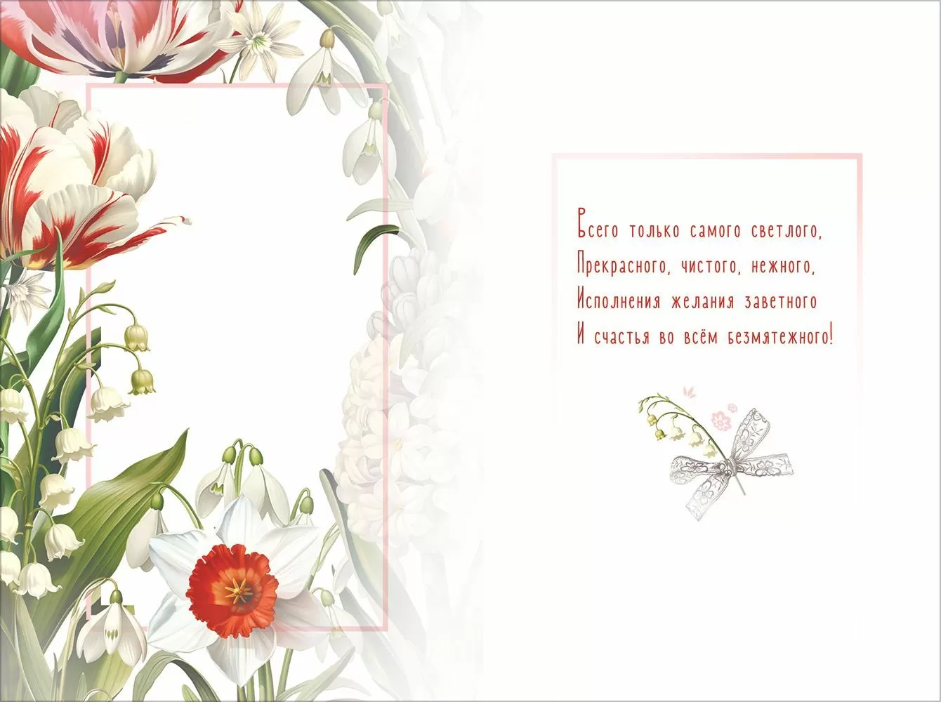 Открытка «8 Марта» в формате А5 станет прекрасным дополнением к подарку и украсит Международный женский день. Весенний сюжет сделает изделие идеальным для каждой! Рамка из чудесных белоснежных цветов с яркими алыми вкраплениями на лепестках поддерживает композицию. Нарциссы, сирень, тюльпаны, ландыши и подснежники станут нежным напоминанием о мартовском празднике. Внутри открытки – замечательные стихи с теплыми пожеланиями. Такой презент можно вручить в дополнение к основному подарку, чтобы украсить поздравление и сделать его более оригинальным. Изделие выполнено из качественных материалов, что обеспечивает ему прочность и долговечность, поэтому оно станет чудесным памятным сувениром для получателя.
