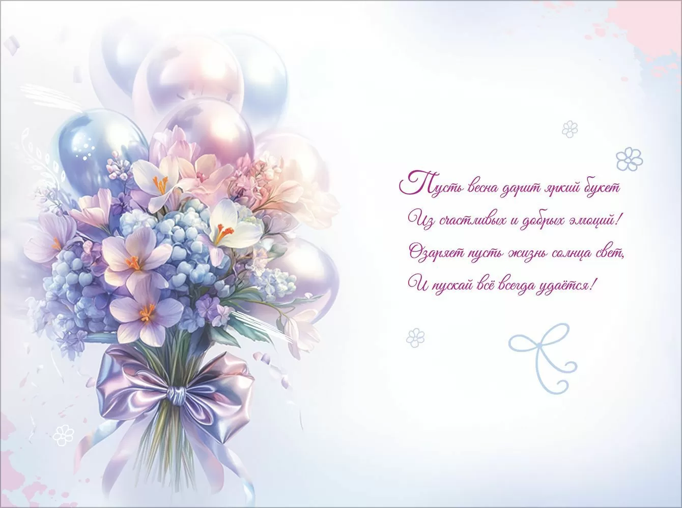 Открытка «С праздником 8 Марта!» в формате А5 станет прекрасным дополнением к подарку и украсит Международный женский день. На изделии изображен волшебный букет весенних цветов с воздушными шарами, перевязанный атласным бантом. Сочетание сиреневых и голубых оттенков создают необыкновенный сказочный эффект, а серебристые блестки лишь усиливают его. Внутри открытки – замечательные стихи с теплыми пожеланиями. Такой презент можно вручить в дополнение к основному подарку, чтобы украсить поздравление и сделать его более оригинальным. Изделие выполнено из качественных материалов, что обеспечивает ему прочность и долговечность, поэтому оно станет чудесным памятным сувениром для получателя.