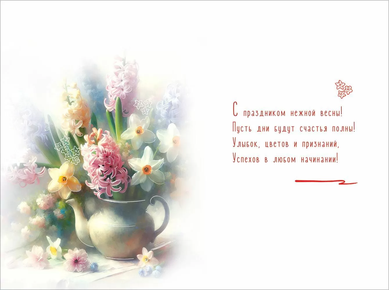 Открытка «С праздником 8 Марта!» в формате А5 станет прекрасным дополнением к подарку и украсит Международный женский день. Необычный дизайн с изображением букета цветов в загадочной дымке делает внешний вид изделия привлекательным для романтичных и мечтательных натур. Мягкие оттенки голубого и розового, солнечные блики и небольшие иллюстрации преобразят праздничный день. Внутри открытки – замечательные стихи с теплыми пожеланиями. Такой презент можно вручить в дополнение к основному подарку, чтобы украсить поздравление и сделать его более оригинальным. Изделие выполнено из качественных материалов, что обеспечивает ему прочность и долговечность, поэтому оно станет чудесным памятным сувениром для получателя.