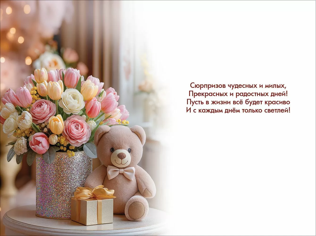Открытка «С 8 Марта!» в формате А5 станет прекрасным дополнением к подарку и украсит Международный женский день. Очаровательный дизайн в пастельно-розовых оттенках порадует каждую! Чудесный букет цветов вместе с симпатичным плюшевым мишкой и подарочной коробочкой составляет праздничную композицию. Размытый фон не перекрывает основной сюжет, но в то же время является неотъемлемой частью картинки. Внутри открытки – замечательные стихи с теплыми пожеланиями. Такой презент можно вручить в дополнение к основному подарку, чтобы украсить поздравление и сделать его более оригинальным. Изделие выполнено из качественных материалов, что обеспечивает ему прочность и долговечность, поэтому оно станет чудесным памятным сувениром для получателя.