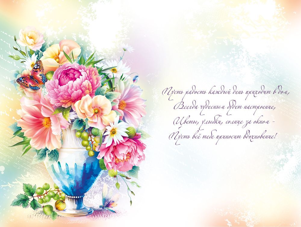 Открытка формата А5 предназначена для поздравления бабушки и ориентирована на использование в розничной продаже и оптовых поставках для сетей, магазинов подарочной продукции и канцелярии. Изделие изготовлено из плотного картона, что обеспечивает стабильную форму, устойчивость к изгибам и разрывам при транспортировке, выкладке и хранении. Готовый размер 182 × 122 мм позволяет удобно размещать открытку в стандартных витринных модулях и упаковочных конвертах сопоставимого формата. Лицевая сторона оформлена полноцветным изображением букета крупных садовых цветов в вазе с детализированными элементами ягод, бабочки и стрекозы на светлом градиентном фоне, над композицией расположен текст «Любимой бабушке». Поверх цветной печати нанесены радужные блестки в лаке, создающие акцент на отдельных фрагментах иллюстрации и повышающие износостойкость внешнего слоя за счет дополнительного защитного покрытия. Внутри открытки предусмотрен заранее напечатанный поздравительный текст, что удобно для конечного покупателя и сокращает время обслуживания в рознице при выборе готового решения к празднику. Картонная основа хорошо держит сгиб и не деформируется при многократном открывании, что важно для сохранения внешнего вида изделия в течение всего периода реализации и последующей эксплуатации получателем. Открытка поставляется в упаковке по 10 штук, что упрощает учет, формирование заказов и планирование полочного пространства, а также позволяет использовать позицию как типовой артикул для сезонных и постоянных матриц ассортимента. Универсальная цветочная тематика и нейтральная стилистика оформления подходят для поздравления с днем рождения, юбилеем, семейными и календарными праздниками, что расширяет период продаж и снижает риск остатка нереализованной продукции к окончанию сезона.