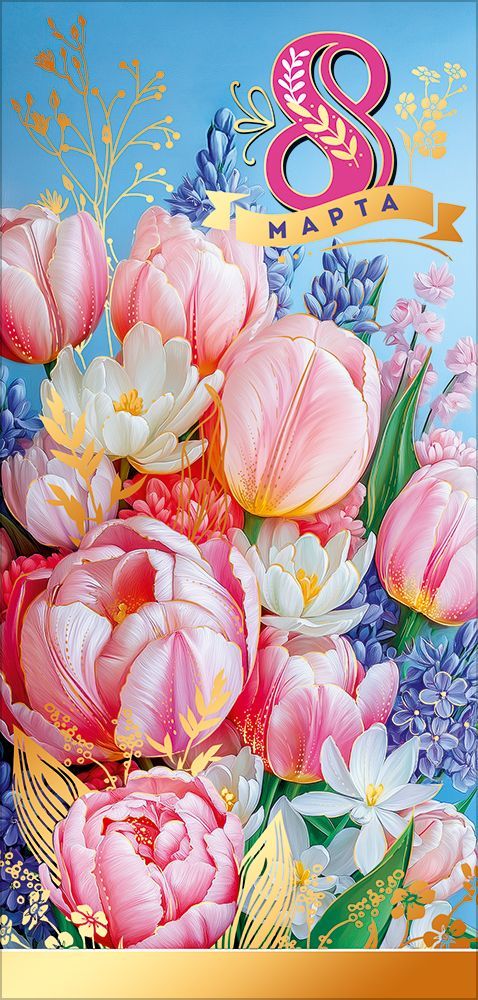Открытка формата евро предназначена для оформления поздравлений к 8 Марта и построена на вертикальной композиции с крупным цветочным букетом на голубом фоне. Изделие изготовлено из плотного картона, что обеспечивает стабильную форму, устойчивость к изгибам и удобство размещения в стандартных конвертах и витринных стойках. Лицевая сторона оформлена детализированным изображением тюльпанов, гиацинтов и других весенних цветов, дополненным декоративными элементами и акцентами с применением золотой фольги; фольгирование создаёт чёткие блестящие контуры, устойчивые к истиранию при аккуратной транспортировке и многоразовом перекладывании в процессе оптовой обработки товара. Внутренняя сторона открытки без текста, что позволяет использовать изделие в широком ассортименте подарочных наборов и адаптировать под разные сценарии поздравления — от корпоративных вручений сотрудникам и клиентам до индивидуальных подписей от семьи или частных дарителей. Гладкая поверхность картона подходит для письма шариковыми и гелевыми ручками, маркерами, при этом краска не растекается и остаётся читаемой. Размер готового изделия 204 × 97 мм обеспечивает совместимость с распространёнными почтовыми и подарочными конвертами, а также удобство выкладки на полках и в напольных или настольных дисплеях. Открытка поставляется по 10 штук, что удобно для формирования товарных запасов, планирования выкладки по сезонам и оптимизации логистики: упаковка компактна, хорошо штабелируется, не деформируется при стандартных условиях хранения. Нейтральный по стилю, но тематически однозначный дизайн с акцентом на надпись «8 Марта» позволяет включать данную модель в линейку праздничных товаров как универсальное решение для женской аудитории разного возраста и статуса, сочетая её с цветами, сладостями и сувенирной продукцией.