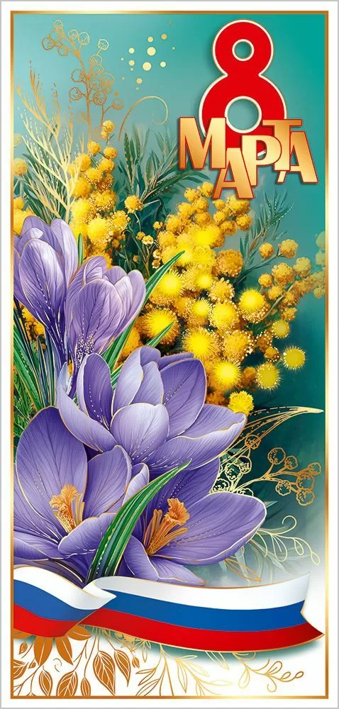 Открытка «8 Марта» в формате «евро» станет прекрасным дополнением к любому подарку! Дизайн открытки наполнен весенними мотивами — сочетанием голубых и жёлтых оттенков, символизирующих пробуждение природы. Нежные цветы крокусов гармонично соседствуют с солнечными веточками мимозы, а внизу расположена праздничная лента триколора, добавляющая композиции торжественности. Такой презент можно вручить в дополнение к основному подарку, чтобы украсить поздравление и сделать его более оригинальным. Изделие выполнено из качественных материалов, имеет высокое качество, обеспечивая ему прочность и долговечность, а также отделку в виде придающей изделию роскошного блеска золотой фольги, поэтому оно станет чудесным памятным сувениром для получателя.