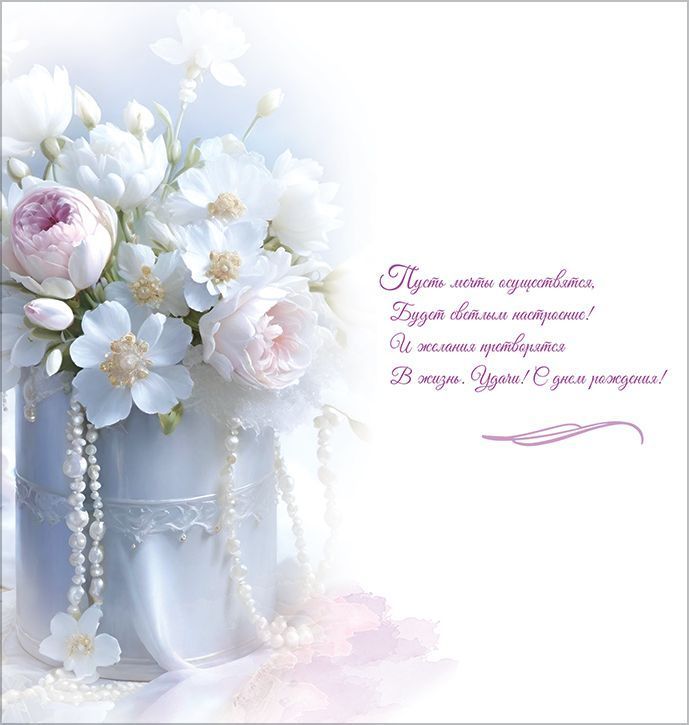 Открытка формата «Евро» предназначена для оформления поздравлений с днём рождения и ориентирована на использование в розничной продаже и оптовых поставках для магазинов подарков, канцелярии и сувенирной продукции. Изделие выполнено из плотного картона, что обеспечивает достаточную жёсткость, устойчивость к изгибам и сохранность формы при хранении, транспортировке и выкладке в торговом зале. Лицевая сторона оформлена полноцветным изображением букета из белых и нежно-розовых цветов на мягком голубом фоне, с декоративными жемчужными элементами и надписью «С Днём Рождения!», что позволяет использовать открытку как универсальное решение для поздравления взрослых адресатов, в том числе в деловом или официальном контексте. Печать выполнена с применением глянцевого ВД-лака, за счёт чего изображение приобретает дополнительную чёткость и защиту от истирания, а поверхность менее подвержена загрязнениям при частом контакте. Внутри предусмотрен готовый поздравительный текст, что удобно при массовых поздравлениях и снижает время подготовки к вручению; при необходимости остаётся пространство для внесения личных дополнений от дарителя. Длина готового изделия составляет 204 мм, ширина 97 мм, параметры соответствуют стандартному «евро»-формату, что облегчает подбор конвертов и использование в существующих ассортиментных матрицах. Стандартные габариты позволяют компактно размещать открытки в настольных и напольных стоечных дисплеях, на крючках и полках, а также оптимизировать складские остатки и упаковку при транспортировке. В одной упаковке — 10 одинаковых открыток, что удобно для формирования серийных выкладок, планирования объёмов закупки и использования в корпоративных поздравительных кампаниях, где требуется единый визуальный стиль.