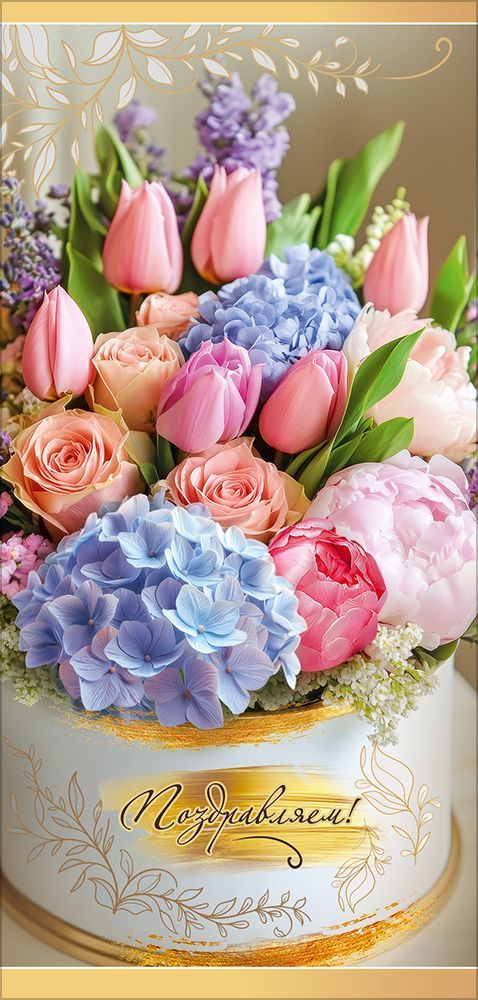 Открытка формата евро выполнена из плотного картона с глянцевым ВД-лаком, что обеспечивает устойчивость к истиранию, сохранение яркости красок и аккуратный вид при частых перекладках и транспортировке. На лицевой стороне размещена детализированная композиция из тюльпанов, роз, гортензий и пионов в декоративной коробке с надписью «Поздравляем!», оформленной на фоне золотистых мазков и тонкого растительного орнамента. Такое нейтральное поздравительное оформление подходит для широкого спектра поводов: дни рождения, юбилеи, профессиональные праздники, семейные торжества, поздравления коллег и партнёров. Внутри открытка без текста, что удобно для оптовых покупателей, формирующих универсальный ассортимент: одно и то же изделие может использоваться в разных сценариях, в том числе в корпоративном сегменте, при индивидуальной подписи от компании или вручении с подарком. Чётко выдержанные размеры 204 × 97 мм позволяют хранить и экспонировать открытки в стандартных евро-стойках, кассетах и витринах, а также использовать типовые конверты соответствующего формата. Картонная основа оптимальной толщины сохраняет форму изделия, не коробится и не перегибается при транспортировке упаковками, что снижает процент брака и упрощает логистику при крупной поставке. Глянцевое лаковое покрытие подчёркивает цветопередачу сложной цветочной гаммы и одновременно защищает поверхность от случайных загрязнений и потёртостей при контакте с руками покупателей. В упаковке 10 экземпляров, что удобно для формирования полочного запаса, планирования закупок и учёта остатков. Для розничного покупателя открытка представляет собой готовое решение к поздравлению: достаточно вписать индивидуальное пожелание, вложить в конверт или вручить вместе с букетом или подарочным набором, при этом универсальный дизайн уместен как в личных, так и в деловых ситуациях.