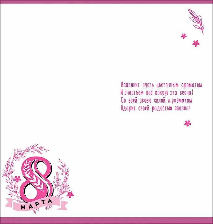 Открытка «8 Марта» в формате «евро» станет прекрасным дополнением к любому подарку! На открытке изображён изящный букет из розовых тюльпанов и белоснежных соцветий, собранных в прозрачную стеклянную вазу. Мягкое сочетание розовых, белых и зелёных оттенков создаёт ощущение свежести, уюта и нежности. Светлый фон подчёркивает воздушность композиции, а аккуратные детали — листья, лепестки и отражения на стекле — придают изображению реалистичность. Такая открытка передаёт атмосферу весеннего тепла, заботы и праздничного настроения. Внутри открытки — трогательные стихи с теплыми пожеланиями. Такой презент станет изящным дополнением к основному подарку, подчеркнёт внимание и сделает поздравление особенно запоминающимся. Изделие выполнено из качественных материалов и отличается высокой чёткостью печати, что гарантирует прочность, долговечность и делает открытку замечательным памятным сувениром для получателя.