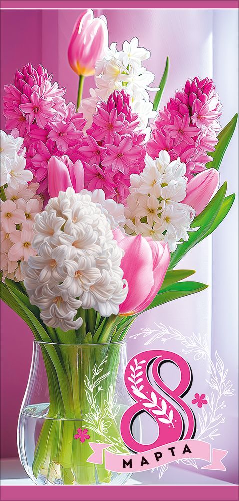 Открытка формата Евро выполнена из плотного картона с полноцветной печатью и глянцевым ВД-лаком, что повышает износостойкость лицевой стороны и устойчивость изображения к истиранию при транспортировке и хранении. На лицевой стороне размещена композиция из тюльпанов и гиацинтов в стеклянной вазе на розовом фоне и крупное графическое обозначение «8 Марта», что однозначно определяет назначение изделия как поздравительной открытки к Международному женскому дню. Готовое изделие имеет длину 204 мм и ширину 97 мм, что соответствует стандартному Евро-формату и обеспечивает совместимость с распространёнными конвертами, удобство выкладки на полке и в напольных или настольных стойках. Внутри предусмотрен заранее напечатанный поздравительный текст, позволяющий использовать открытку без дополнительной подготовки, что актуально как для розничных покупателей, так и для корпоративных поздравлений при массовой рассылке. Картон сохраняет форму, не деформируется при аккуратном сгибе и выдерживает многократное открывание, благодаря чему открытка подходит для пересылки почтой и длительного хранения получателем. Глянцевая поверхность подчёркивает насыщенность розовых и белых оттенков, при этом лаковый слой облегчает удаление случайных загрязнений сухой салфеткой. Упаковка содержит 10 открыток, что удобно для оптовых закупок, формирования сезонного ассортимента и планирования тиражей под праздничный период в магазинах подарков, канцелярии, цветочных салонах и у корпоративных заказчиков. Дизайн с универсальным цветочным сюжетом подходит для поздравлений женщин разных возрастов и статусов, может использоваться отдельно или в комплекте с букетами, подарочными наборами и сувенирной продукцией.