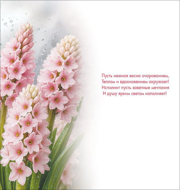 Открытка формата «Евро» предназначена для оформления поздравлений к 8 Марта в розничном и корпоративном сегментах. Изделие изготовлено из плотного картона, обеспечивающего стабильную геометрию и сохранность формы при складском хранении, транспортировке и выкладке в торговом зале. Готовый размер открытки 204 × 97 мм удобен для размещения в стандартных евроконвертах и настольных витринах, что упрощает планирование ассортимента и логистики для оптовых закупок. Лицевая сторона оформлена полноцветным изображением розовых цветов с каплями воды и надписью «С 8 Марта!», что делает открытку актуальной для поздравления женщин в офисе, торговых организациях, на предприятиях и в частном использовании. Применение глянцевого ВД-лака повышает износостойкость поверхности, защищает печать от истирания и придаёт изображению выраженный блеск, сохраняя читаемость надписей и насыщенность красок при многократных контактах в процессе продажи и вручения. Внутри размещён поздравительный текст, оставляющий свободное поле для личной подписи, что позволяет использовать открытку как готовое решение для массовых поздравлений, так и для индивидуальных обращений. Конструкция изделия оптимальна для хранение в стопах без деформации, что важно при формировании больших партий к сезону весенних праздников. Количество в упаковке 10 обеспечивает удобство учёта при оптовых поставках, позволяет планировать выкладку по сериям и формировать наборы для розничной продажи, а также использовать открытки в качестве стандартного расходного материала при подготовке подарков сотрудницам, клиентам и партнёрам.