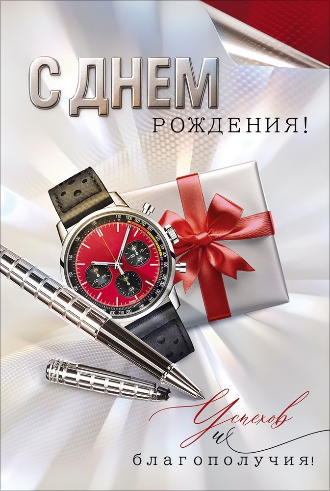 Открытка формата А5 предназначена для поздравления с днём рождения и ориентирована на деловой и универсальный сегмент получателей. Изделие выполнено из плотного картона, что обеспечивает достаточную жёсткость, устойчивость к сгибам и сохранение первоначального вида при транспортировке и хранении в складских условиях. Готовый размер 182×122 мм позволяет размещать открытку в стандартных конвертах соответствующего формата и удобно использовать в составе подарочного набора. Двустороннее изображение включает оформленную лицевую сторону с тематическим рисунком в деловом стиле: наручные часы, металлическая ручка и подарок с красной лентой, что подчёркивает статусность и подходит для поздравления мужчин, коллег, партнёров и клиентов, а также внутренний разворот с заранее нанесённым поздравительным текстом, сокращающим время подготовки к вручению при массовых поздравлениях. Конструкция дополнена внутренним карманом/клапаном для денег, сертификатов или подарочных карт, что расширяет функциональность изделия и делает его удобным для использования в розничных и корпоративных подарочных сценариях. Отделка без дополнительных декоративных эффектов обеспечивает нейтральный, аккуратный внешний вид, снижает риск повреждения при пересортице и облегчает штабелирование в коробах. Открытка поставляется по 10 штук, что удобно для оптовых закупок, планирования ассортимента и формирования однородных витрин. Плотный картон и точные геометрические размеры способствуют стабильному качеству при повторных заказах, а универсальная деловая тематика изображения позволяет включать позицию в постоянный ассортимент магазинов подарков, книжных сетей, канцелярских отделов и корпоративных служб снабжения для регулярного использования в системе поздравлений сотрудников и партнёров.