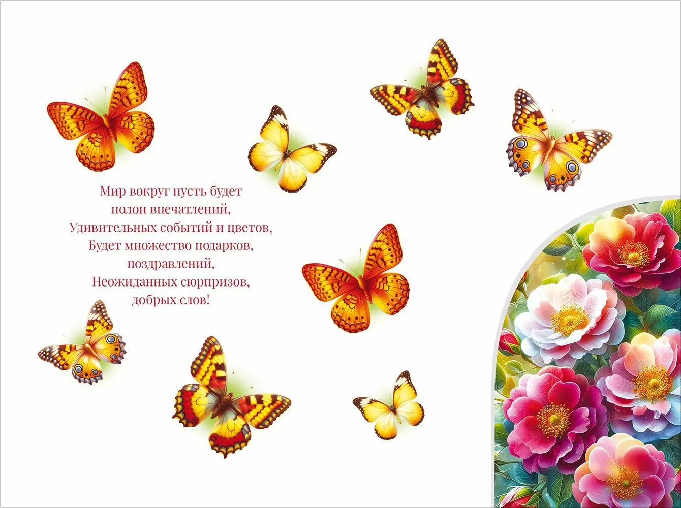 Открытка «От всей души с Днем Рождения!» (венок из ярких цветов, бабочки)