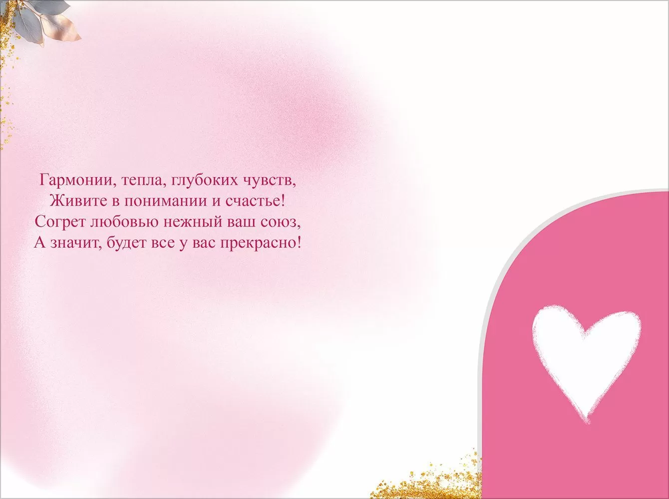 Открытка формата А5 предназначена для поздравления молодожёнов и может использоваться как самостоятельный подарочный элемент или как дополнение к основному презенту. Изделие выполнено из плотного картона, что обеспечивает устойчивость к деформации при транспортировке и хранении, а также сохраняет форму при размещении на витрине или в почтовом конверте. Готовый размер 182 × 122 мм позволяет закладывать открытку в стандартные конверты соответствующего формата и удобно комплектовать её с денежным подарком или сертификатом. Конструктив с внутренним карманом/клапаном рассчитан на безопасное размещение купюр, подарочных карт или небольших плоских вложений; клапан фиксирует содержимое и снижает риск его выпадения при вручении или пересылке. Двустороннее изображение обеспечивает оформленность как лицевой, так и внутренней стороны: снаружи размещена композиция с свадебным тортом, бокалами, цветами, подарочными коробками и надписью «С Днём свадьбы!», внутри предусмотрено поле для текстового поздравления, при этом визуальное решение выдержано в единой цветовой гамме. Отделка без дополнительных декоративных слоёв упрощает упаковку больших тиражей, уменьшает риск повреждения покрытия при механическом воздействии и делает изделие менее чувствительным к царапинам и истиранию в процессе оборота. Для оптового сегмента открытка удобна в логистике: стандартный формат, ровные края и однородный картон позволяют компактно укладывать продукцию в коробки, формировать стабильные стопы и оптимизировать место на складе и в торговом зале; в упаковке 10 штук, что подходит для планирования ассортимента по категориям «Свадьба» и «Праздничные открытки». Для розничного покупателя изделие решает задачу аккуратного и визуально согласованного оформления денежного подарка на свадьбу, при этом внутренняя поверхность пригодна для нанесения текста любыми распространёнными пишущими средствами без сильного размытия и просвечивания. Универсальный сюжет с традиционными свадебными атрибутами делает открытку применимой для широкого круга адресатов, а использование плотного картона способствует сохранению внешнего вида на всём протяжении мероприятия и при последующем хранении в качестве памятного сувенира.