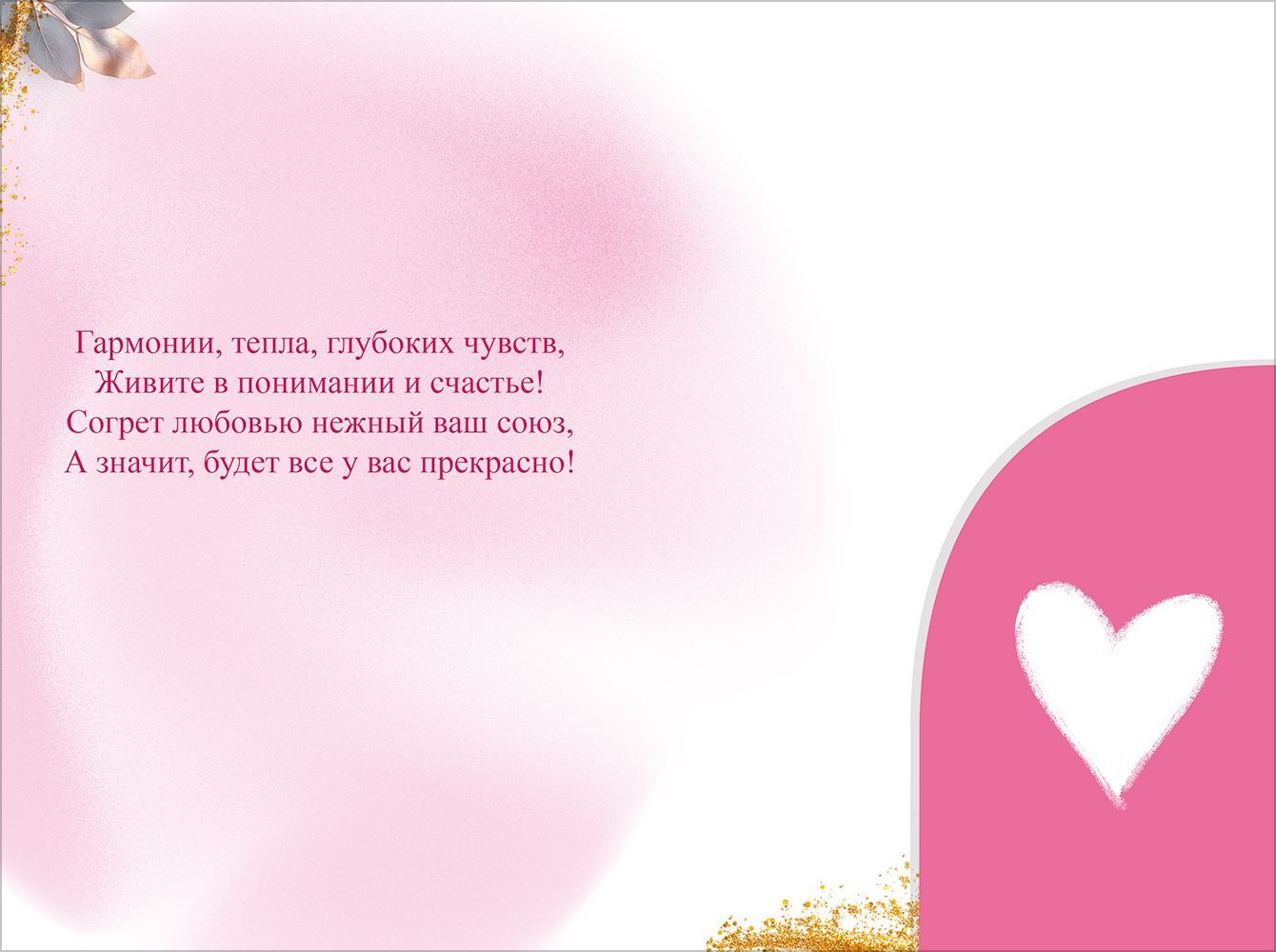 Открытка формата А5 предназначена для оформления свадебного поздравления и рассчитана на использование как в розничной продаже, так и в оптовых поставках для магазинов подарков, канцелярии и сетевой розницы. Изделие изготовлено из плотного картона, обеспечивающего стабильную геометрию и сохранение формы при хранении, транспортировке и многократных перекладках в торговом зале. Готовый формат открытки в сложенном виде составляет 182 × 122 мм, что удобно для стандартной выкладки на полках и в настольных стойках, а также совместимо с распространёнными форматами почтовых конвертов. Двустороннее изображение включает оформленную лицевую сторону с тематическим свадебным сюжетом в розово-золотистой гамме и декоративными элементами (торт, цветы, бокалы, кольца, подарочные коробки и воздушные шары), а также оборотную сторону, согласованную по стилю и предназначенную для размещения дополнительной информации о товаре и краткого поздравительного текста. Внутри открытки расположен текст с готовым поздравлением, что снижает временные затраты конечного покупателя на оформление послания и делает изделие удобным для быстрой покупки в день торжества. Конструктивно открытка дополнена карманом/клапаном для денег, что позволяет использовать её одновременно как поздравительный носитель и аккуратную упаковку для денежного подарка, сертификата или небольшой плоской вложенной карты; карман выполнен из того же картона, что обеспечивает достаточную жёсткость и надёжную фиксацию вложения. Отделка без дополнительных декоративных слоёв упрощает хранение крупными партиями, снижает риск повреждения покрытия при транспортировке и делает изделие предсказуемым по сроку службы: поверхность устойчива к умеренным механическим воздействиям, не отслаивается и не крошится. В упаковке 10 экземпляров, что удобно для формирования полочного ассортимента, планирования закупок по оборачиваемости и оптимизации складских остатков. Открытка может использоваться как самостоятельный элемент поздравления либо в составе подарочного набора с цветами, сладостями или сувенирами, подходит для оформления поздравлений молодожёнам в день регистрации брака, на выездной церемонии или семейном торжестве в ресторане.