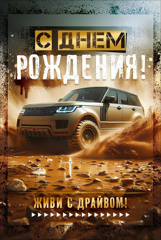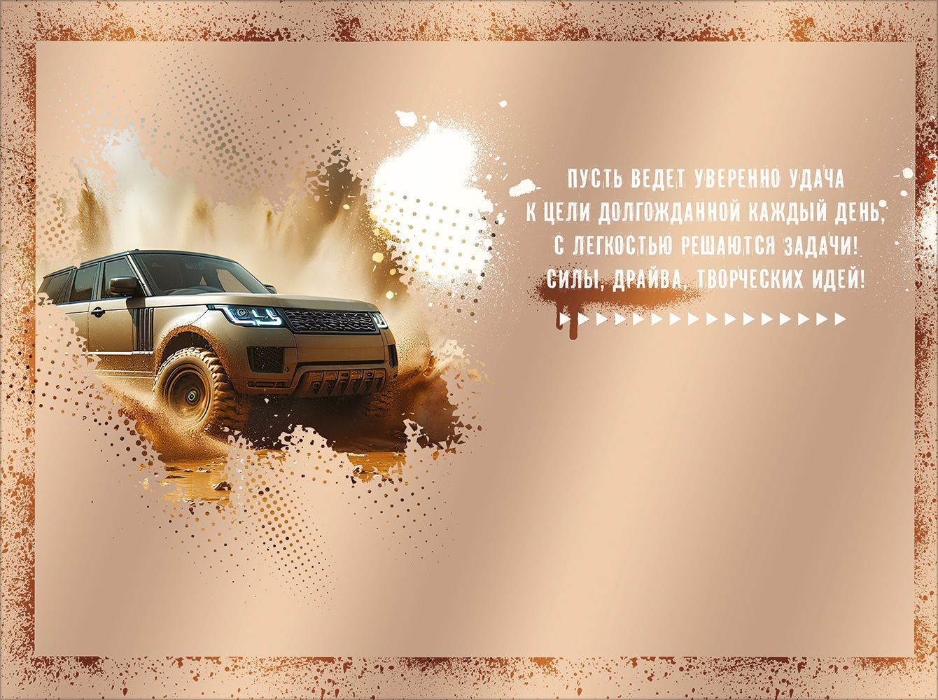 Открытка формата А5 предназначена для поздравления с днём рождения и ориентирована на мужскую аудиторию, интересующуюся автомобилями и активным образом жизни. Изделие изготовлено из плотного картона, что обеспечивает стабильную геометрию, чёткое сохранение формы и устойчивость к изгибам при хранении, транспортировке и выкладке в торговом зале. Лицевая сторона оформлена полноцветным изображением современного внедорожника в динамичном движении по грязевой трассе, с крупной надписью «С ДНЁМ РОЖДЕНИЯ!» и нижней фразой «Живи с драйвом!», что делает открытку уместной для поздравления коллег, партнёров, друзей и родственников. Двусторонняя печать позволяет использовать оборотную сторону как продолжение оформления: внутренняя часть содержит уже готовый поздравительный текст, который сокращает время подготовки к вручению и обеспечивает единый стилистический уровень для всех экземпляров в партии. Размеры готового изделия 182 × 122 мм обеспечивают совместимость с распространёнными почтовыми и подарочными конвертами, удобство размещения на витринах и в стандартных торговых лотках. В упаковке 10 штук, что удобно для оптовых закупок: партия оптимальна для формирования полочного ассортимента, планирования сезонных и тематических предложений, а также для равномерного распределения по розничным точкам. Картонная основа и отсутствие дополнительной отделки делают открытку технологичной в производстве и предсказуемой по качеству: печать устойчива к выцветанию при обычных условиях эксплуатации, поверхность не бликует и позволяет при необходимости дописать индивидуальное пожелание ручкой или маркером. Изделие подходит для использования в качестве самостоятельного подарочного элемента или дополнения к основному подарку, а также для корпоративных поздравлений, где важно выдержать единый визуальный стиль и контролируемую себестоимость тиража.