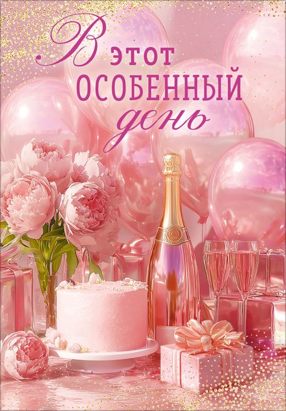 Открытка «В этот особенный день» (торт, шампанское, букет, подарки, воздушные шары)