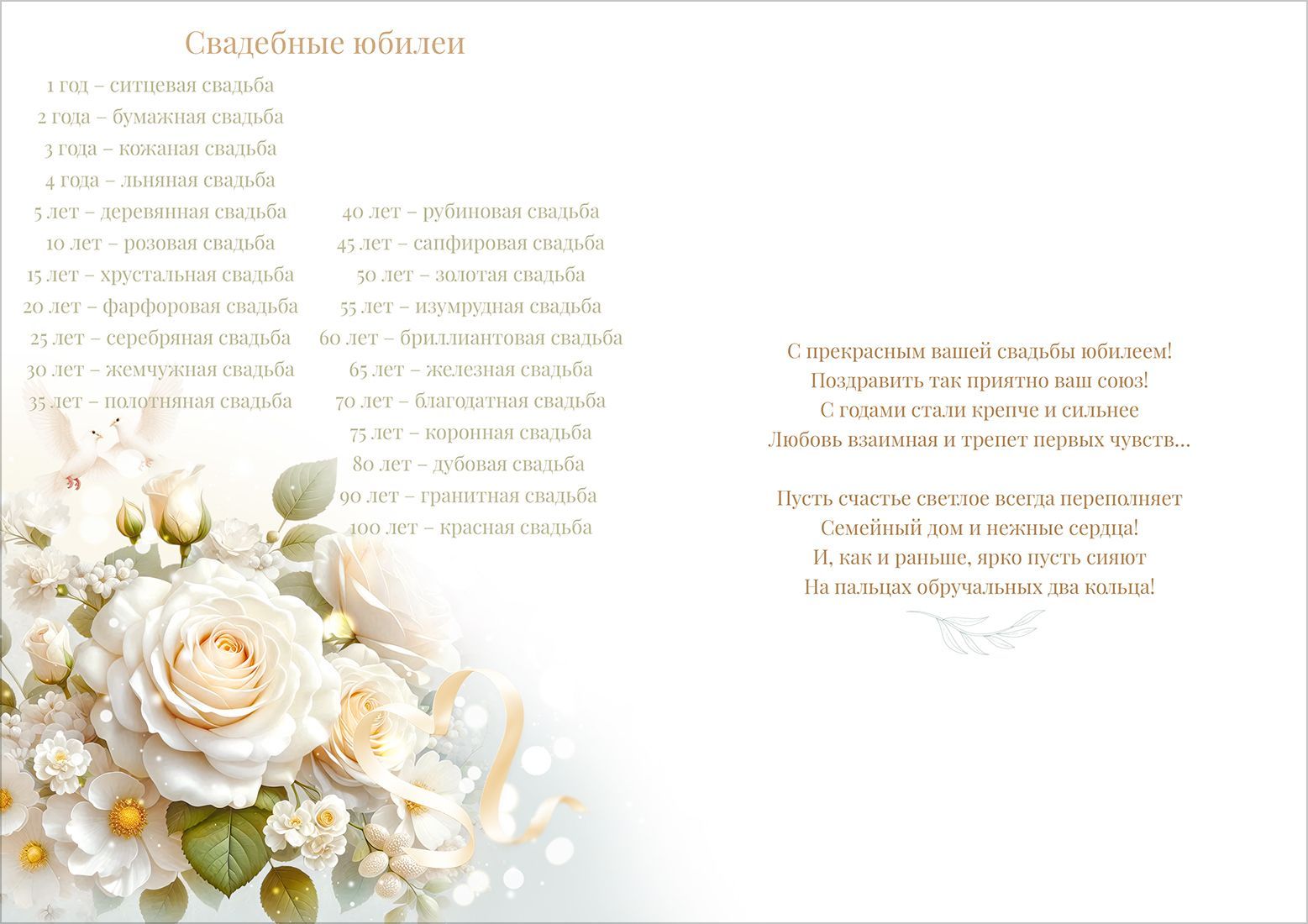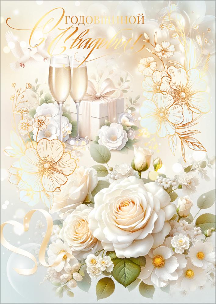 Открытка формата А4 предназначена для поздравления с годовщиной свадьбы и ориентирована на использование в розничной продаже и оптовых поставках для магазинов подарков, книжных сетей и канцелярских отделов. Изделие изготовлено из плотного картона, что обеспечивает устойчивость к изгибам, истиранию и механическим воздействиям при транспортировке и выкладке. Двустороннее изображение позволяет использовать открытку как самостоятельный поздравительный элемент без дополнительного декора: на лицевой стороне размещена композиция из белых и кремовых роз, декоративных цветов, подарочной коробки и бокалов шампанского, дополненная надписью «С годовщиной свадьбы», на обороте предусмотрено продолжение оформления и зона для персональной подписи. Внутри размещён готовый поздравительный текст, что сокращает время обслуживания в рознице и упрощает выбор для конечного покупателя. Золотая фольга используется в оформлении надписей и отдельных элементов рисунка, создавая чёткие акценты и устойчивый к выцветанию блеск, визуально выделяющий изделие на полке и обеспечивающий единый уровень качества в партии. Габаритные размеры готового изделия — длина 277 мм и ширина 196 мм — позволяют размещать открытку в стандартных витринных стойках и на полках формата А4, а также использовать в наборах с конвертами соответствующего размера. Плотный картон сохраняет геометрию при вертикальной демонстрации и длительном хранении на складе, не деформируется при нормальных условиях влажности и температуры, что важно для оптовых закупок с длительным оборотом. Открытка подходит для поздравления супругов разного возраста и может использоваться как самостоятельный подарок или как дополнение к букету, подарочному набору или сертификату. Упаковка содержит 10 одинаковых изделий, что удобно для формирования ассортиментной матрицы и планирования заказов по группам «Праздник» и «Свадьба/годовщина» без дополнительной сортировки по дизайнам.