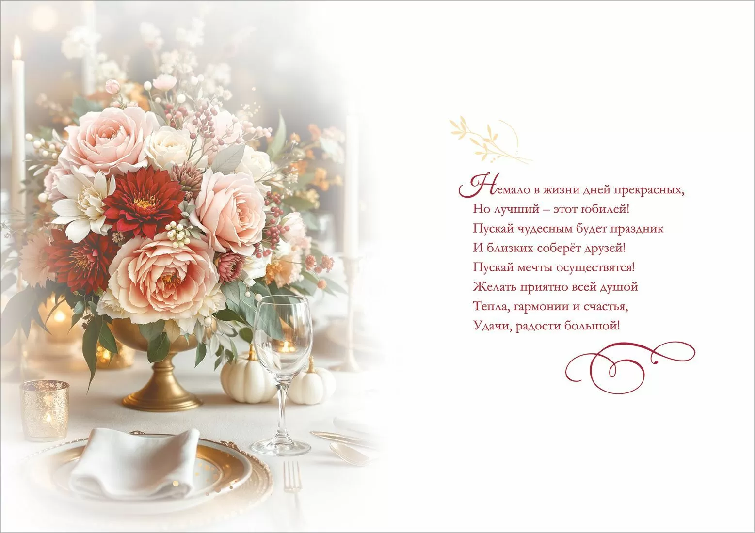 Открытка "С юбилеем!" – идеальное решение для поздравления с праздником! С размерами 196х277 мм она прекрасно подходит для торжественных событий. Украшенная радужными блестками в лаке, поздравительная открытка выглядит очаровательно и привлекает внимание. На открытке изображена ваза с чудесным букетом из роз, которая стоит на празднично сервированном столе в ожидании гостей. Поздравительная открытка изготовлена из прочного материала, который хорошо держит форму. Открытка не помнется при транспортировке и использовании. Сверху на картонную основу нанесено четкое полноцветное изображение. Благодаря высокому качеству печати и защитному покрытию краски не выцветут, и открытка на праздник будет радовать адресата многие годы. В одной упаковке – 10 шт.
