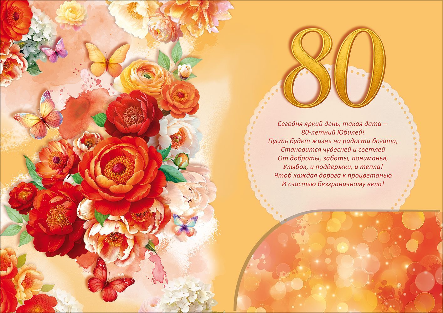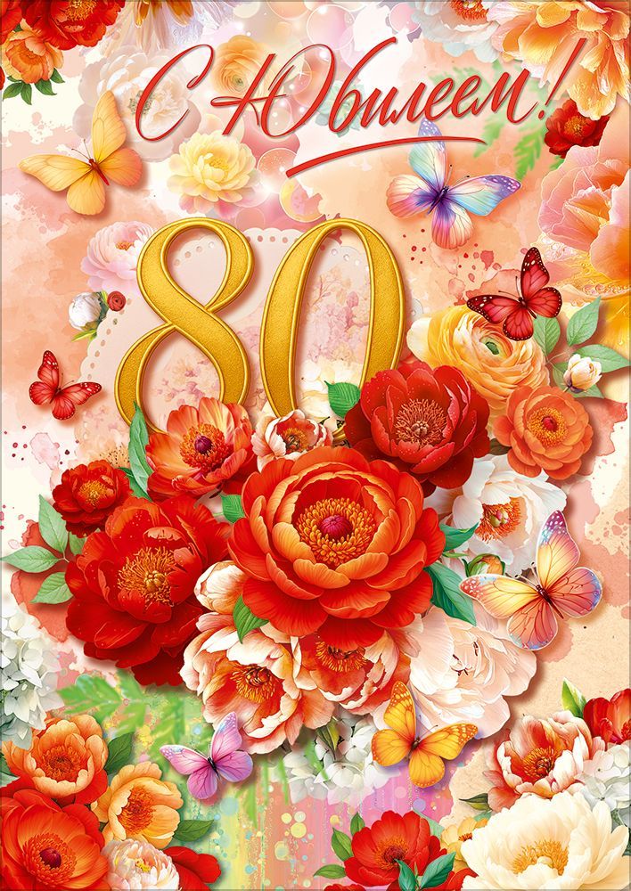 Открытка «С Юбилеем! 80 лет» (цветы, бабочки)