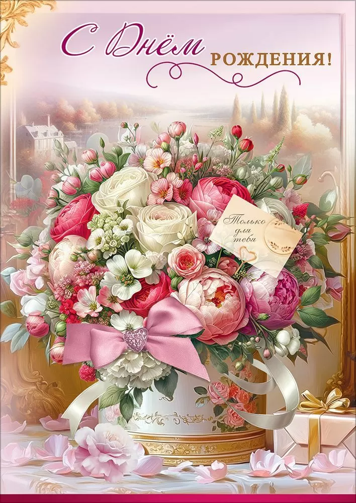 Открытка "С днем рождения! Только для тебя" с клапаном для денег – идеальное решение для поздравления с праздником! С размером А4 (196х277 мм) она прекрасно подходит для торжественных событий. Приятная иллюстрация с шикарными розами в круглой коробке украшена голографическими блестками в лаке. Открытка выглядит очаровательно и привлекает внимание. Поздравительная открытка изготовлена из прочного материала, который хорошо держит форму. Открытка не помнется при транспортировке и использовании. Сверху на картонную основу нанесено четкое полноцветное изображение. Благодаря высокому качеству печати и защитному покрытию краски не выцветут, и открытка на праздник будет радовать адресата многие годы. В одной упаковке – 10 шт.
