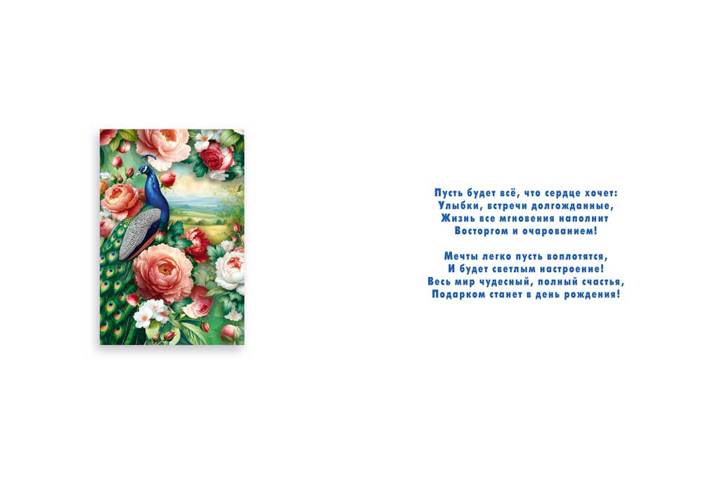 Открытка формата А4 предназначена для поздравления с днём рождения и ориентирована на использование в ассортименте розничных и сетевых магазинов, книжных, цветочных салонов и сувенирных отделов. Изделие изготовлено из плотного картона, что обеспечивает устойчивость к изгибам, сохранение формы при транспортировке и хранении, а также аккуратный внешний вид на витрине и после вручения. Лицевая сторона оформлена полноцветным изображением павлина на фоне крупных садовых цветов с надписью «С ДНЕМ РОЖДЕНИЯ!», применяется двусторонняя печать: внутренняя сторона содержит готовый поздравительный текст, что сокращает время обслуживания клиентов и упрощает выбор конечному покупателю. Размер готового изделия 277 × 196 мм позволяет размещать открытку в стандартных конвертах увеличенного формата или использовать как самостоятельный подарочный элемент без конверта. Отделка выполнена радужными блёстками в лаке, создающими выборочное мерцание отдельных фрагментов рисунка и подчёркивающими декоративные детали без утолщения основы, что важно для штабелирования и упаковки в транспортную тару. Изображение устойчиво к истиранию при обычной эксплуатации благодаря защитному лаку и качественной офсетной печати, цвета остаются насыщенными при длительном хранении в торговом зале под освещением. Открытка упакована по 10 штук, что удобно для формирования полочного запаса, выкладки по сериям и планирования закупок по артикулу. Для конечного пользователя изделие подходит как самостоятельное поздравление или дополнение к подарку, хорошо смотрится в композиции с букетом и подарочными пакетами, легко подписывается обычными шариковыми и гелевыми ручками без размазывания чернил.