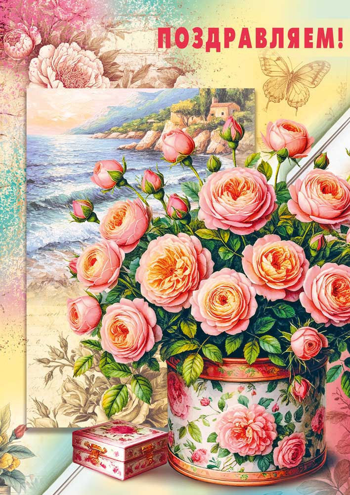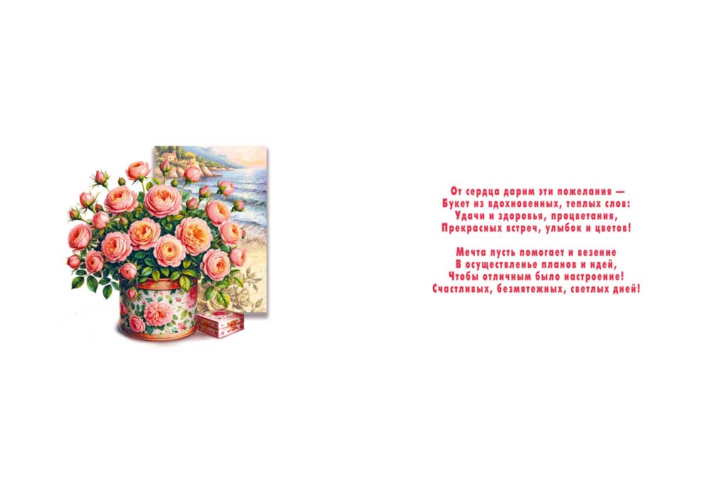 Открытка формата А4 предназначена для универсального поздравительного ассортимента и рассчитана на использование как в розничных продажах, так и в оптовых поставках для магазинов, отделов подарочной продукции и корпоративных закупок. Изделие изготовлено из плотного картона, что обеспечивает устойчивость к изгибам, сохранение геометрии и аккуратный внешний вид при транспортировке и длительном хранении в складских условиях. Готовый размер открытки составляет 277 × 196 мм, что позволяет размещать её в стандартных конвертах соответствующего формата или использовать как самостоятельный поздравительный атрибут без дополнительной упаковки. Лицевая сторона оформлена полноцветным изображением букета роз в декоративной вазе на фоне прибрежного пейзажа, с крупной надписью «Поздравляем!», задействованы двусторонняя печать и блестки в лаке радужные, создающие умеренный декоративный эффект без утяжеления поверхности и не влияющие на удобство укладки в стопы. Обратная сторона также содержит изображение и поздравительный текст, при этом сохраняется свободное поле для внесения персональной подписи или дополнительных пожеланий. Конструкция открытки рассчитана на стандартное использование: вручение к подарку, вложение в цветочные композиции, наборы к праздникам и памятным датам. Поверхность картона подходит для письма большинством распространённых пишущих средств, что важно при массовом оформлении поздравлений в организациях. Упаковка по 10 штук оптимальна для формирования выкладки, планирования остатков и оперативной инвентаризации; изделия удобно хранить в коробах по высоте и ширине без деформации краёв. Открытка может использоваться как универсальное решение для поздравлений с днём рождения, юбилеем, профессиональными и календарными праздниками, что упрощает формирование базового ассортимента и снижает потребность в узкоспециализированных позициях.