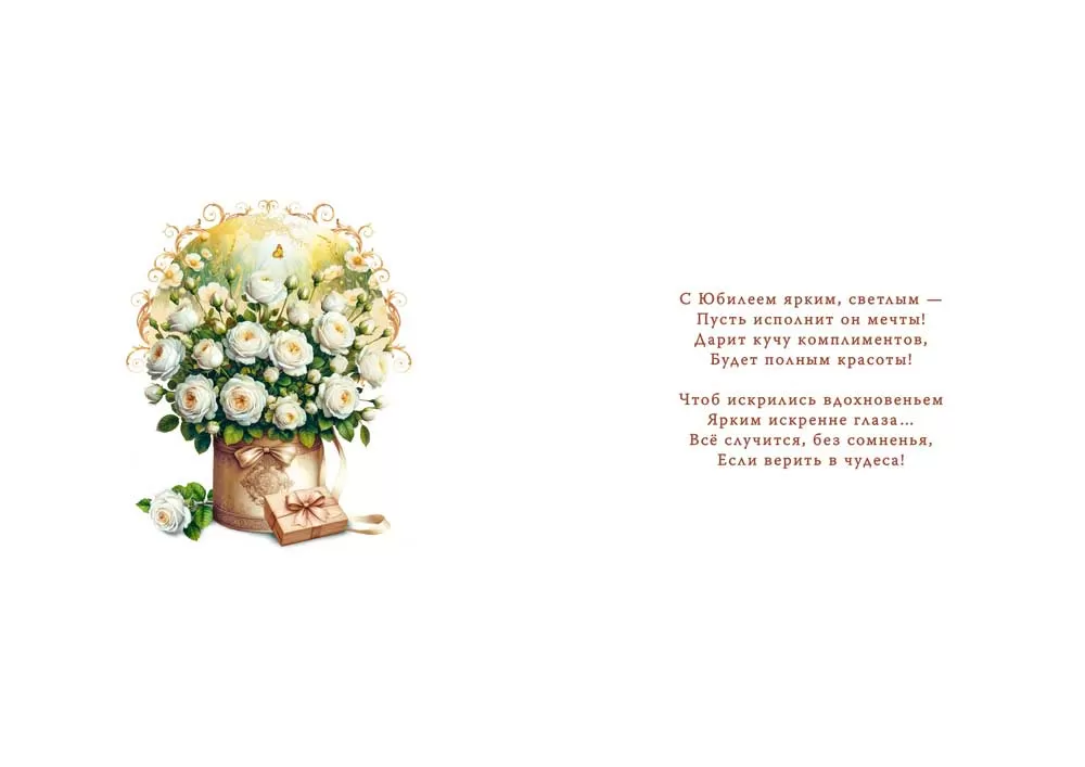 Внутри открытки — трогательные стихи с теплыми пожеланиями. Такой презент станет изящным дополнением к основному подарку, подчеркнёт внимание и сделает поздравление особенно запоминающимся.