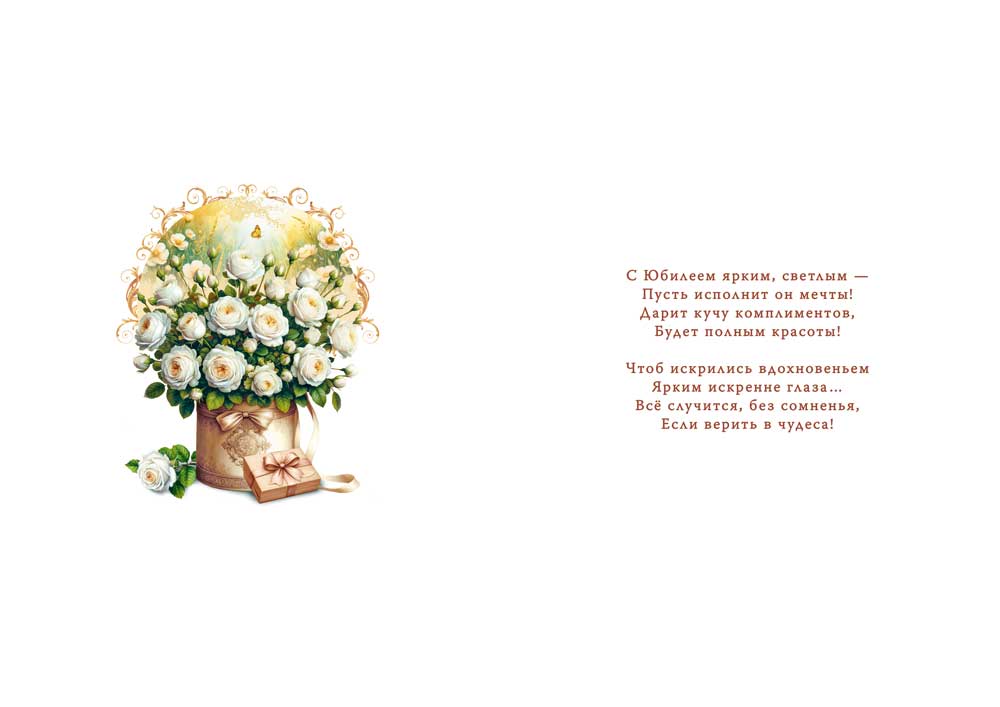 Открытка «С юбилеем!» формата А4 предназначена для оформления поздравлений в индивидуальном и корпоративном сегменте и может использоваться как самостоятельный поздравительный носитель или как дополнение к подарку. Изделие изготовлено из плотного картона, обеспечивающего стабильную геометрию при хранении и транспортировке, а также устойчивость к изгибам и истиранию в торговом обороте. Двустороннее изображение включает лицевую декоративную композицию с букетом белых роз, подарочной коробкой и архитектурным фоном, а также внутренний разворот с заранее нанесённым поздравительным текстом по теме юбилея, что сокращает время обслуживания клиентов в розничной точке и упрощает выбор для конечного покупателя. Радужные блёстки в лаке наносятся локально на элементы иллюстрации, создавая выразительный визуальный акцент при искусственном и дневном освещении; лаковое покрытие фиксирует блёстки и снижает риск осыпания при многократных перекладываниях в торговой выкладке. Габариты готового изделия составляют 277 мм по длине и 196 мм по ширине, что позволяет размещать открытку в стандартных витринных модулях формата А4 и использовать типовые конверты соответствующего формата при отправке по почте или вручении с документами. Плотный картонный оснóвный материал сохраняет форму при вертикальной демонстрации на стендах и подвесных экспозиторах, а также выдерживает транспортировку в коробах без деформаций углов и сгибов. В упаковке 10, что удобно для планирования закупок, формирования полочного ассортимента по праздникам и оптимизации складских остатков. Для частного покупателя открытка подходит для поздравления с юбилеем родственников, коллег и партнёров, обеспечивает достаточную площадь для личной надписи рядом с уже напечатанным текстом и визуально сочетается с классическими подарочными решениями — цветами, сладостями и сувенирами. Универсальная цветовая гамма и нейтральный цветочный мотив делают изделие применимым для широкого круга юбилейных дат и получателей.