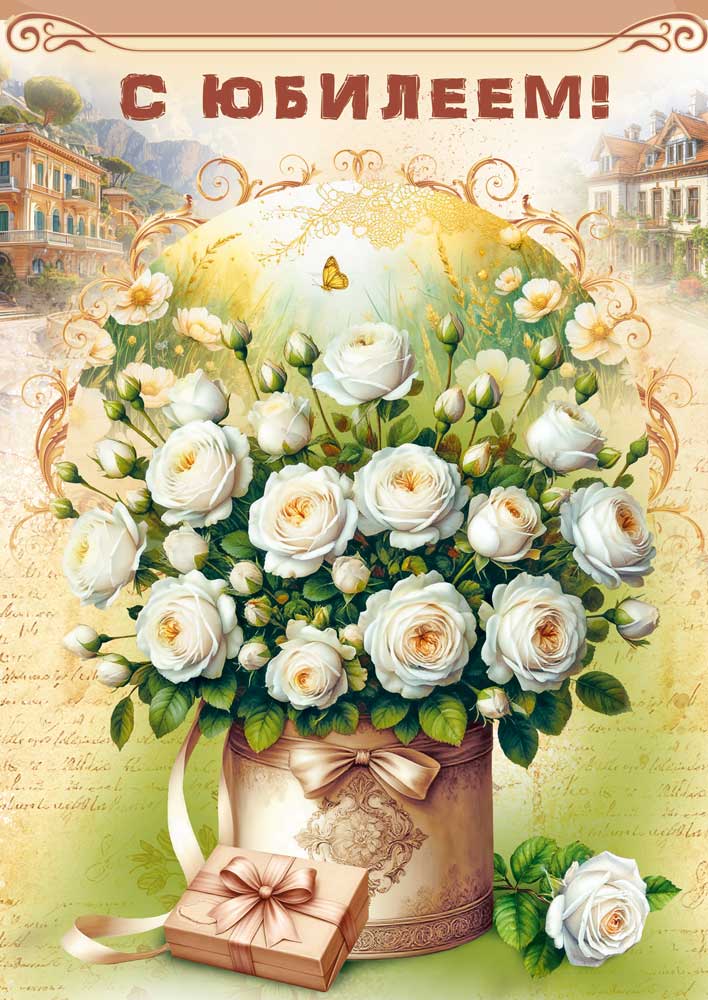Открытка «С юбилеем! (белые розы в коробке)