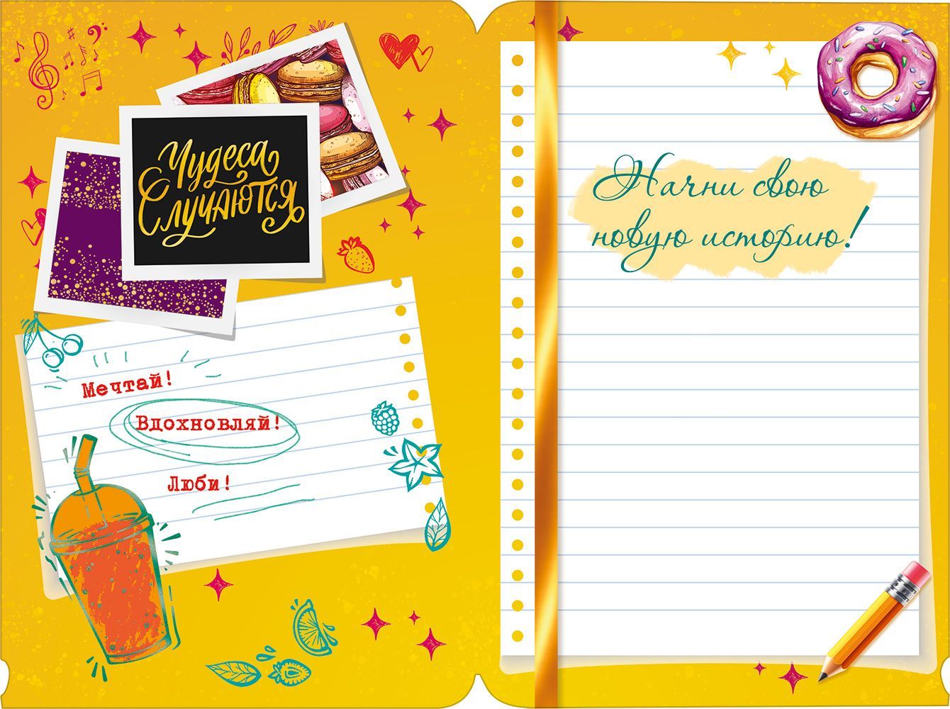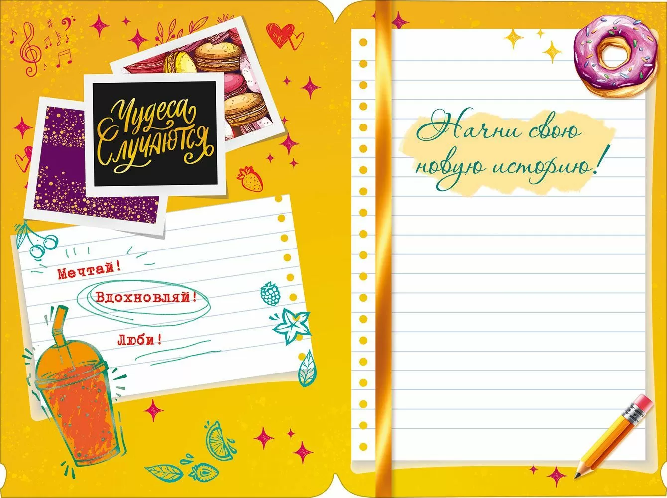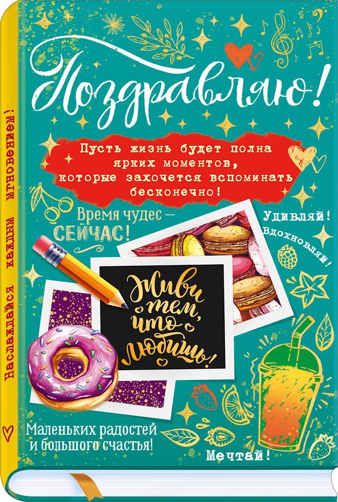 Открытка «Поздравляю!» (книга, карандаш, пончик, снимки, налписи)