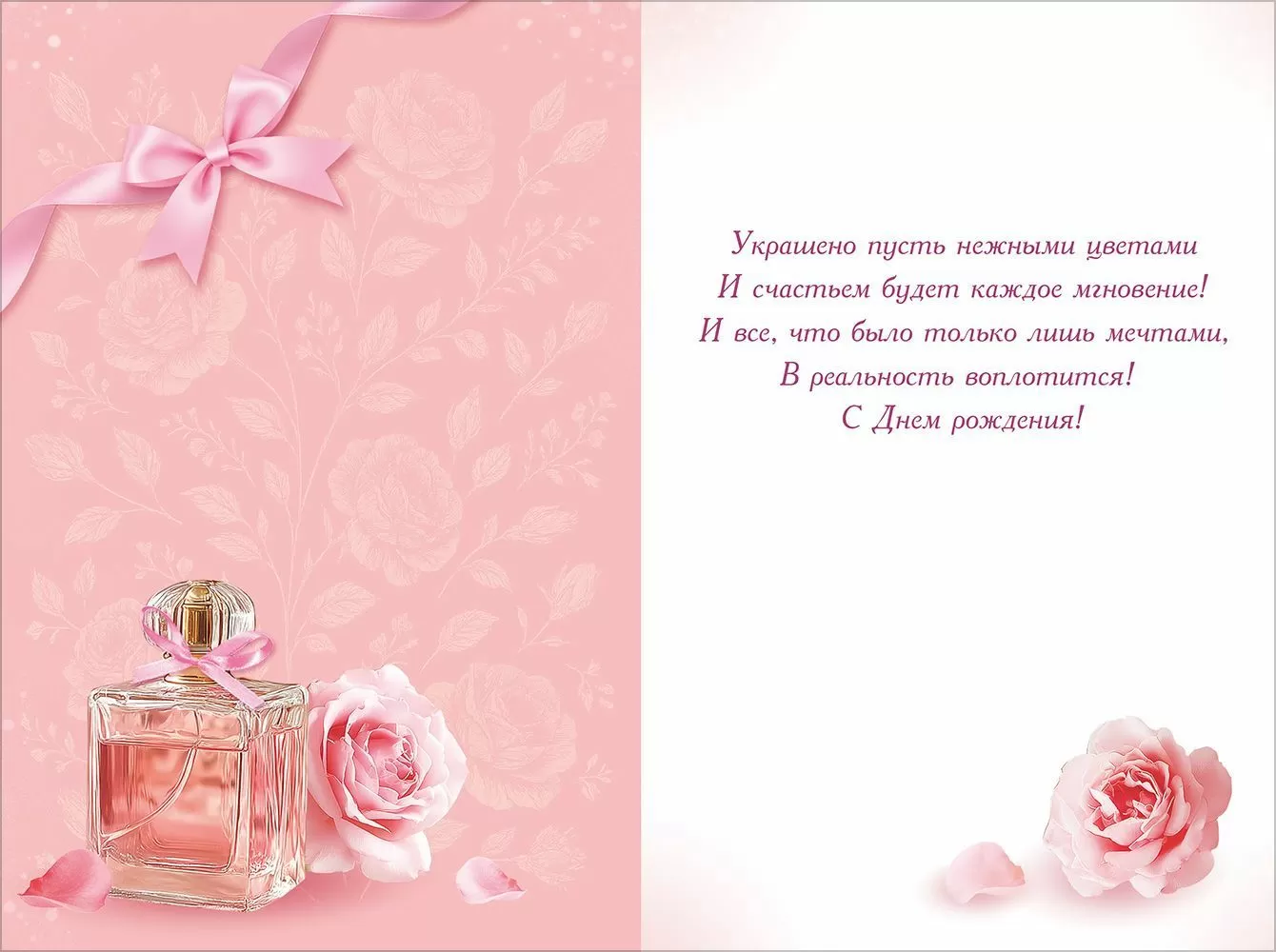 Открытка «С Днем Рождения!» (букет розовых цветов, флакон духов)