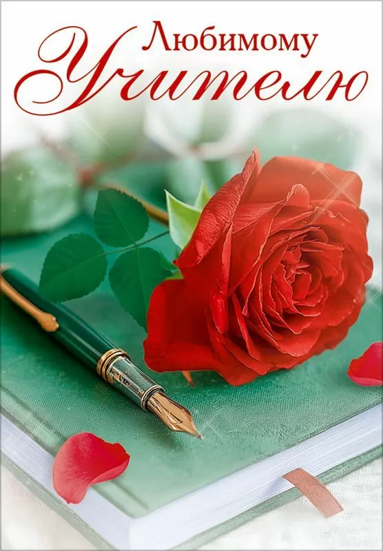 Открытка «Любимому учителю» (красная роза, книга, перо)