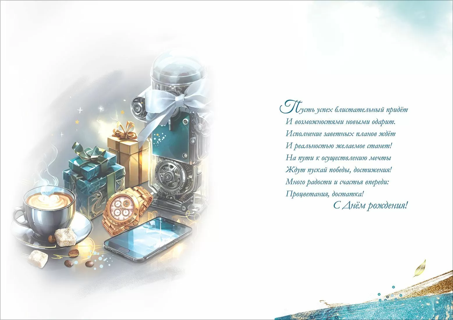 Дизайн изделия выполнен в современном деловом стиле и включает элементы, символизирующие успех и уверенность: часы, смартфон, чашку ароматного кофе и аккуратно упакованные подарки. Сочетание стальных и бирюзовых оттенков с золотыми акцентами придаёт открытке солидность и элегантность, а отделка в виде блесток в лаке придаст ей выразительности, праздничности и презентабельности.