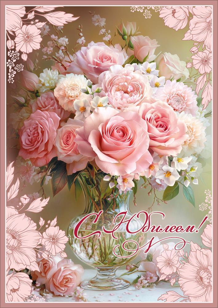 Дизайн выполнен в мягких розово-кремовых оттенках и украшен пышным букетом роз и пионов в стеклянной вазе — символом красоты, уюта и торжества. Лёгкие цветочные узоры по краям и деликатные переливы придают оформлению утончённость и праздничное очарование. Поверхность открытки украшена сияющими блёстками в лаке, которые создают эффект мерцающего сияния и подчёркивают торжественность композиции.