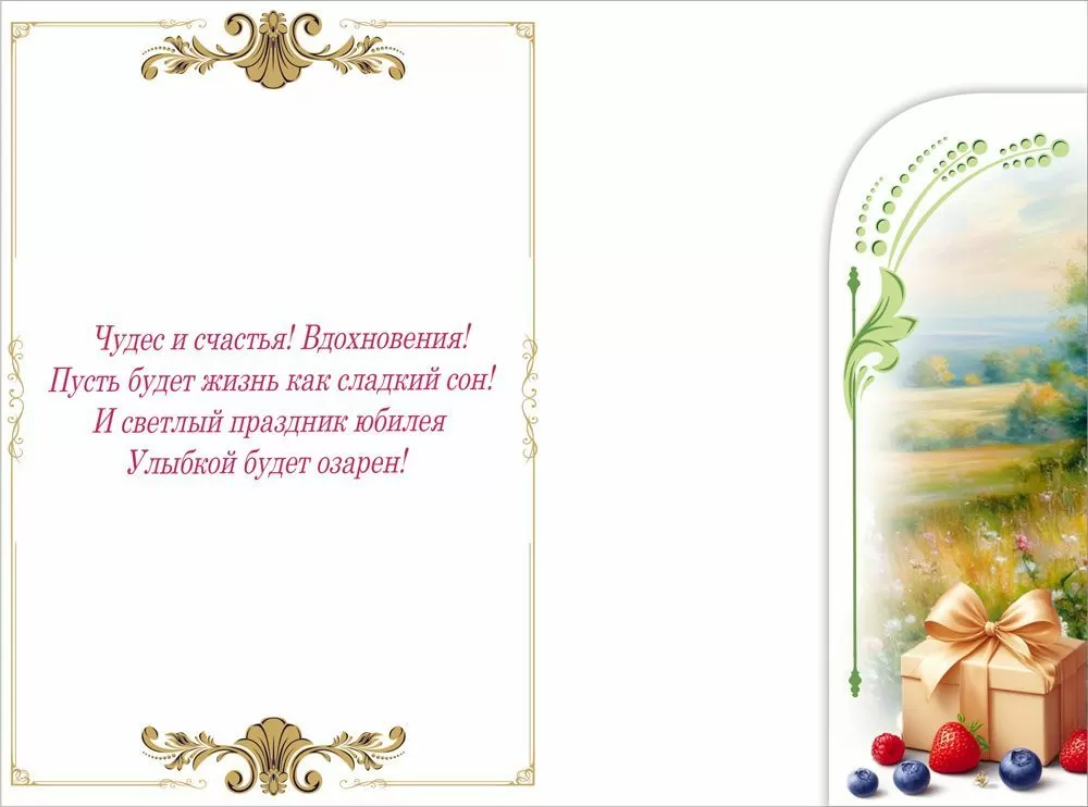 Открытка «С юбилеем!» с клапаном в формате А5 станет прекрасным дополнением к подарку и украсит любое поздравление. Романтичный дизайн придется по душе каждой! На открытке изображено зеленое поле, теряющееся вдали. На переднем плане расположились букет белоснежных роз, чайная пара из фарфора и кусочек ягодного торта. Внутри открытки есть замечательные стихи с теплыми пожеланиями и специальный карман для денег. Такой презент можно вручить в качестве основного подарка или в дополнение к нему, чтобы украсить поздравление и сделать его более оригинальным. Изделие выполнено из качественных материалов, что обеспечивает ему прочность и долговечность, поэтому оно станет чудесным памятным сувениром для получателя.