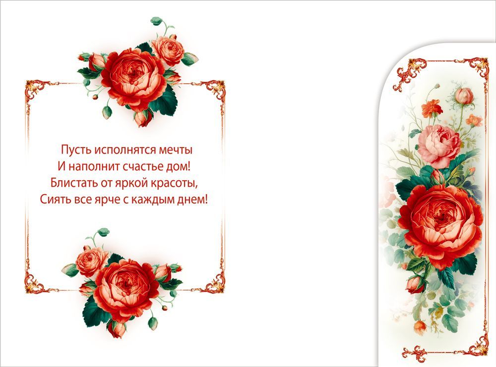 Открытка «С днем рождения!» с клапаном в формате А5 станет прекрасным дополнением к подарку и украсит любое поздравление. Очаровательный дизайн придется по душе каждой! Ярко-красные цветы в центре композиции делают внешний вид изделия особенно привлекательным для тех, кто ценит романтику и красоту во всем. Фигурная рамочка дополняет сюжет и придает ему сказочности. Внутри открытки есть замечательные стихи с теплыми пожеланиями и специальный карман для денег. Такой презент можно вручить в качестве основного подарка или в дополнение к нему, чтобы украсить поздравление и сделать его более оригинальным. Изделие выполнено из качественных материалов, что обеспечивает ему прочность и долговечность, поэтому оно станет чудесным памятным сувениром для получателя.