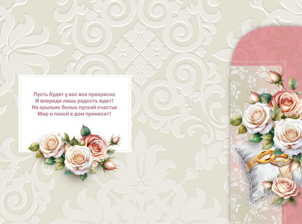 Открытка «С днем свадьбы!» с клапаном в формате А5 станет прекрасным дополнением к подарку и украсит любое поздравление. Романтичный дизайн обязательно придется по душе молодоженам и поднимет им настроение в самый важный день в их жизни! Композиция представляет собой пару белых голубков, сидящих в цветах. Перед ними на подушечке лежат золотые сверкающие кольца. На фоне – приятные пастельно-розовые оттенки и замысловатый орнамент. Внутри открытки есть замечательные стихи с теплыми пожеланиями и специальный карман для денег. Такой презент можно вручить в качестве основного подарка или в дополнение к нему, чтобы украсить поздравление и сделать его более оригинальным. Изделие выполнено из качественных материалов, что обеспечивает ему прочность и долговечность, поэтому оно станет чудесным памятным сувениром для получателя.