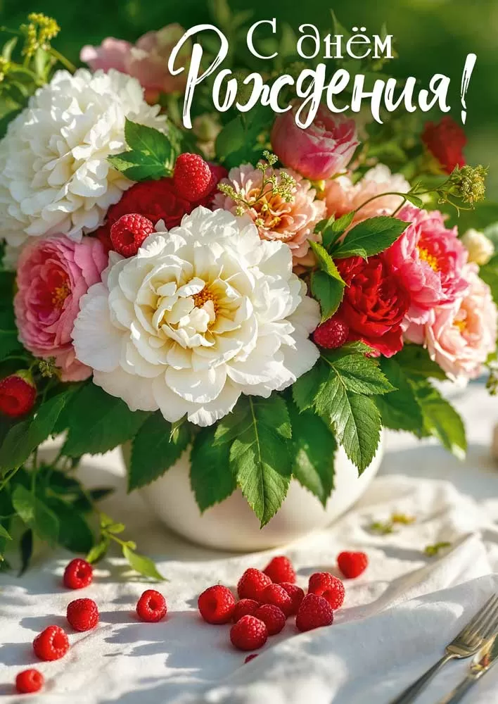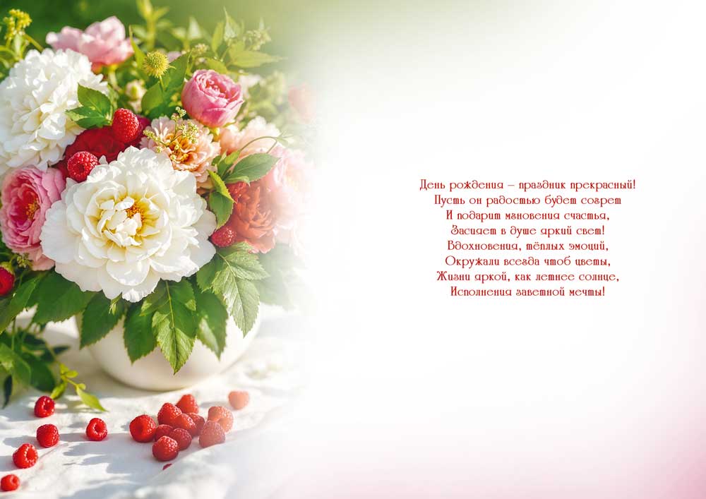 Открытка «С Днем рождения!» в формате А4 станет прекрасным дополнением к любому подарку. Летний дизайн сделает любое поздравление незабываемым! Основой композиции является пышный букет белых, розовых и красных пионов в пузатой белой вазе. Ваза стоит на столе с простой белой скатертью, а на фоне с легким эффектом размытия изображена сочная зелень. Все это создает ощущение застолья на даче, усиливает его яркий солнечный свет. Вокруг вазы по столку рассыпана малина. Ягодки также можно рассмотреть и в букете цветов. Внутри открытки – замечательные стихи с теплыми пожеланиями. Такой презент можно вручить в дополнение к основному подарку, чтобы украсить поздравление и сделать его более оригинальным. Изделие выполнено из качественных материалов, что обеспечивает ему прочность и долговечность, поэтому оно станет чудесным памятным сувениром для получателя.
