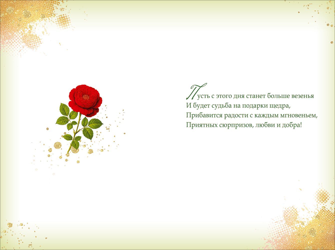 Открытка «С Юбилеем» формата А5 предназначена для оформления поздравления имениннику или юбиляру в частном и корпоративном сегменте. Изделие изготовлено из плотного картона, что обеспечивает стабильную геометрию, устойчивость к изгибам и сохранение товарного вида при многократных перегрузках в процессе складской обработки и транспортировки. Размер готовой открытки 182 × 122 мм позволяет закладывать её в стандартные конверты соответствующего формата и удобно размещать на витрине или в напольных стойках. Лицевая сторона содержит полноцветное двухстороннее изображение крупного букета красных и белых садовых роз на зелёном фоне с надписью «С Юбилеем!»; внутренняя сторона предусматривает зону для письменного поздравления и может использоваться как для индивидуального текста, так и для типового сценария вручения от коллектива, партнёров или клиентов. Печать выполнена с применением фольги золотой, за счёт чего надпись и отдельные декоративные элементы обладают выраженным металлическим блеском и читаемостью под разными углами освещения; это повышает заметность открытки в выкладке и позволяет использовать её в качестве самостоятельного подарочного акцента при оформлении букета или подарка. Картонная основа хорошо выдерживает точечные нагрузки при размещении в почтовых отправлениях, коробах и стеллажах, не коробится при кратковременном воздействии умеренной влажности помещения и не просвечивает при нанесении надписей стандартными шариковыми и гелевыми ручками. Универсальный сюжет с цветочной композицией подходит для широкого круга получателей разного возраста и статуса, что облегчает планирование ассортимента для оптовых закупок. В упаковке 10 открыток, что удобно для формирования полочной матрицы, учёта остатков и пополнения запаса в магазинах подарков, цветочных салонах, канцелярских и книжных отделах.