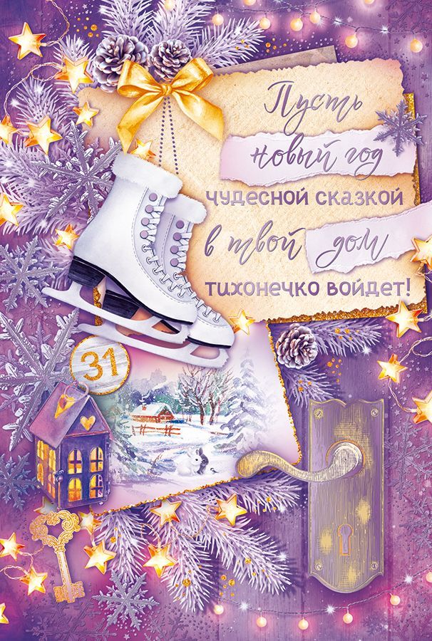 Открытка формата А5 изготовлена из плотного картона, что обеспечивает стабильную геометрию изделия при транспортировке, хранении и выкладке в торговом зале. Готовый размер 182 × 122 мм позволяет использовать открытку как самостоятельный поздравительный носитель, совместимый с большинством стандартных конвертов соответствующего формата. На лицевой стороне размещена новогодняя композиция с изображением коньков, зимнего пейзажа, декоративных еловых ветвей, шишек, ключа и дверной ручки, дополненная календарной датой «31» и поздравительным текстом «Пусть новый год чудесной сказкой в твой дом тихонечко войдет!». Внутри открытка без текста, что удобно для оптовых покупателей, формирующих универсальный ассортимент: одно и то же изделие подходит для частных и корпоративных поздравлений, а также для доработки под фирменный стиль. Отделка включает блестки в лаке и лавандовую фольгу, за счет чего изображение имеет выраженные акцентные зоны и устойчивый декоративный эффект при искусственном и дневном освещении; используемые материалы рассчитаны на серийное складское хранение без осыпания и потери цвета при соблюдении стандартных условий. Картонная основа оптимальна для нанесения надписей шариковыми и гелевыми ручками, маркерами и тонкими фломастерами, чернила не растекаются и остаются разборчивыми. Открытка поставляется по 10 штук, что удобно при формировании полочного запаса, фасовке по сериям и планировании сезонных продаж. Изделие ориентировано на использование в качестве новогоднего поздравления для родственников, друзей, коллег и деловых партнеров, подходит для вложения к подарку, оформления почтовых отправлений и новогодних наборов, а также для применения в розничных и корпоративных подарочных проектах, где требуется единый визуальный стиль и предсказуемое качество исполнения.