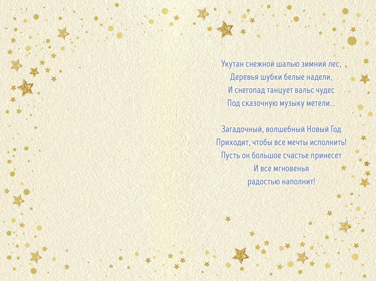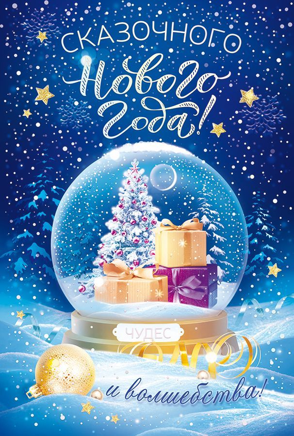 Открытка формата А5 выполнена из плотного картона, обеспечивающего стабильную геометрию изделия и устойчивость к деформации при хранении и транспортировке в крупных партиях. Готовое изделие имеет длину 182 мм и ширину 122 мм, что соответствует стандартным почтовым и конвертным форматам и упрощает интеграцию в существующий ассортимент поздравительной продукции. Лицевая сторона оформлена новогодней композицией с изображением стеклянного шара со снежным пейзажем, подарками и еловой гирляндой на фоне зимнего ночного неба; присутствует внешнее поздравление в тематике Нового года. Для выделения ключевых элементов дизайна используется фольга голографическая серебряная, создающая выразительные световые акценты и повышающая визуальную заметность открытки на полке, при этом покрытие устойчиво к истиранию при многократном перекладывании в торговой выкладке. Внутри открытка не содержит текста, что удобно для оптовых покупателей, работающих с различными целевыми аудиториями: одно и то же изделие подходит как для личных поздравлений, так и для корпоративных подписей от имени компании, с возможностью нанесения индивидуального текста вручную или при помощи печати. Универсальная новогодняя тематика делает открытку применимой для розничной продажи в сезонных коллекциях, подарочных наборах, корпоративных комплектах с сувенирной продукцией и в качестве вложения в заказ. Количество в упаковке — 10, что оптимально для формирования мелкооптовых и розничных партий, удобной фасовки и учета на складе. Компактный размер и плоская форма способствуют рациональному использованию складского пространства и упрощают транспортировку коробами и паллетами. Открытка совместима с большинством стандартных конвертов соответствующего формата, что облегчает использование в почтовых рассылках и курьерских отправлениях.