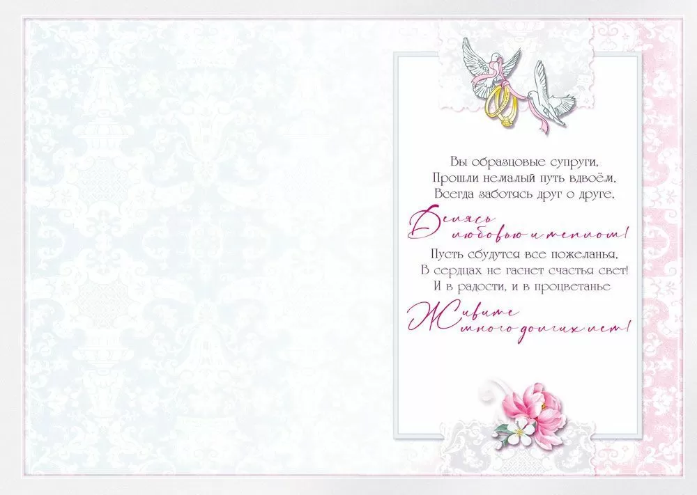 Юбилей свадьбы – это прекрасная возможность вспомнить волнующее и трогательное семейное событие и устроить новый праздник! Эта оригинальная открытка привлекает внимание своей мягкой цветовой гаммой. Традиционный сюжет с цветами, голубями, кольцами и бокалами с шампанским подчёркивает трепетную торжественность неповторимого момента. Отделка золотой фольгой и лаком выглядит очень ярко и изысканно. Внутри тёплое стихотворное пожелание. Такую открытку захочется сохранить как приятное воспоминание о самом чудесном дне!