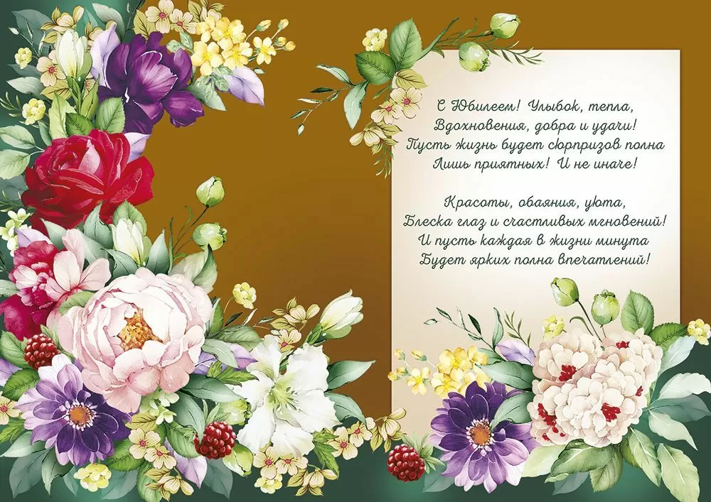 Большая поздравительная открытка "С Юбилеем!" с изображением роскошных цветов! Женственная композиция, отделка блестками и теплые слова — залог идеального поздравления!