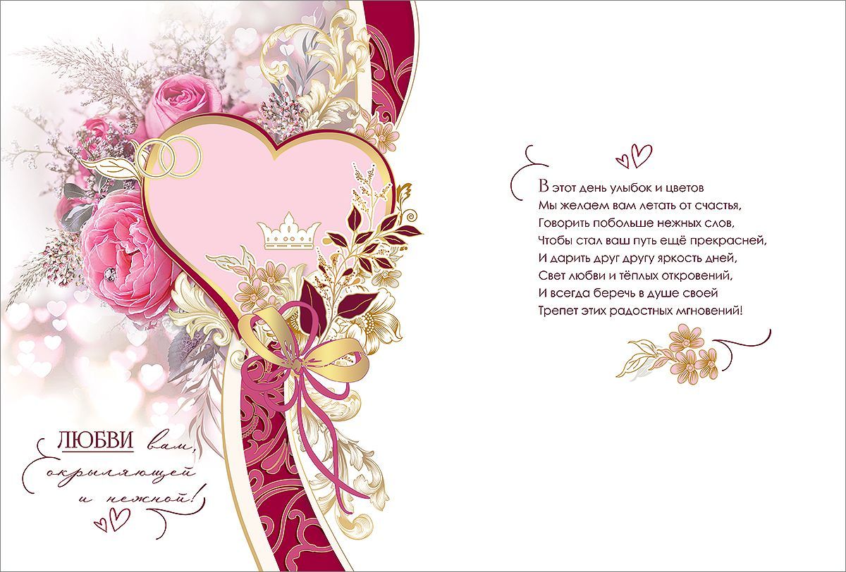Открытка формата А4 предназначена для оформления поздравлений в день свадьбы и ориентирована на использование в розничной продаже и оптовых поставках для магазинов подарочной и канцелярской продукции. Изделие изготовлено из плотного картона, что обеспечивает стабильную форму, устойчивость к изгибам и сохранение внешнего вида при транспортировке и выкладке в торговом зале. Лицевая сторона оформлена цветочной композицией с изображением пионов и розовых бутонов на светлом фоне, в центральной части размещено крупное сердце с надписью «В прекрасный день свадьбы» и декоративными обручальными кольцами. Дополнительный визуальный акцент создают элементы с золотой фольгой и конгревом: они подчёркивают контуры орнамента, ленты и декоративных деталей, придают изображению рельеф и подчёркивают зоны с текстом, что важно при оформлении премиальной свадебной полки. Внутри открытки размещён поздравительный текст, согласованный по стилю с внешним оформлением, что позволяет использовать изделие без дополнительной доработки и экономит время конечного покупателя. Длина готового изделия 276 мм, ширина 205 мм, что облегчает подбор конверта соответствующего формата, а также планирование места на стеллажах и в коробах при оптовой логистике. Поверхность картона пригодна для нанесения подписи шариковыми и гелевыми ручками без размазывания чернил. Открытка поставляется в упаковке по 10 штук, что удобно для формирования заказа, учёта остатков и поддержания постоянного ассортимента свадебной тематики. Такое исполнение подходит для продажи поштучно, формирования наборов к подарку, использования в цветочных салонах и праздничных агентствах при комплексном оформлении свадебных мероприятий.